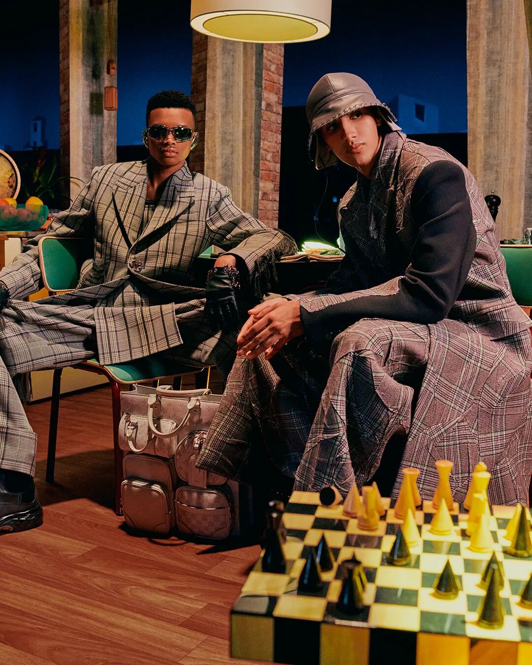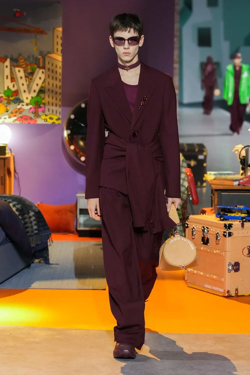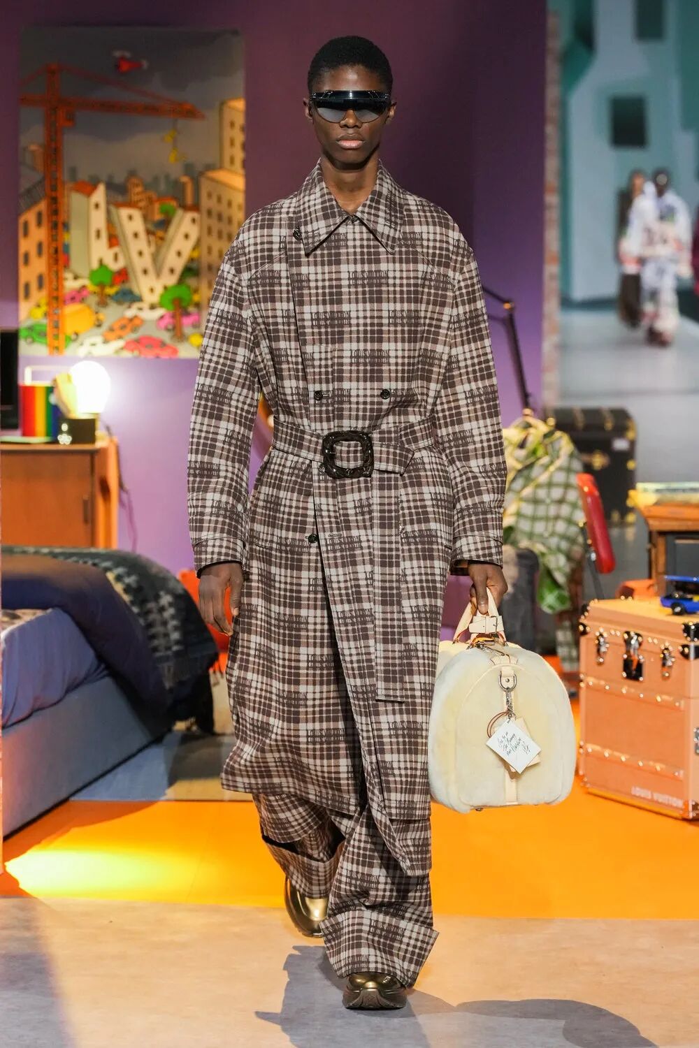 Colm Dillane将自己最拿手的明亮色彩与天马行空的画作巧妙的融入街头与正装轮廓之中,炮制出不少吸睛之作。被放大的眼睛、夸张的人脸面孔,铺陈于西装和工装之上。尤其是设计师绘制的不知名面孔画作,化身为印制在成衣中的印花图案,超现实风格的表现手法,颇具特色。西服套装和大衣款还加上了品牌经典的棋盘格元素。