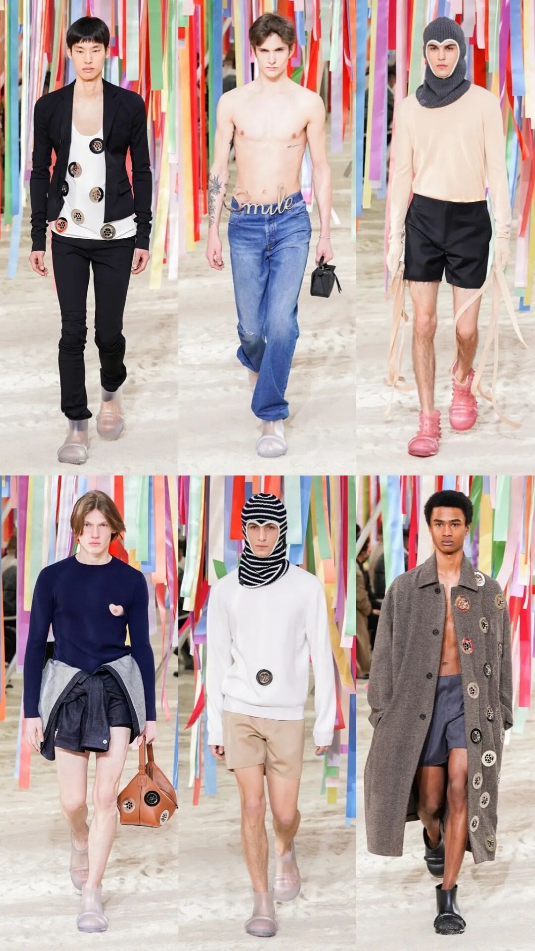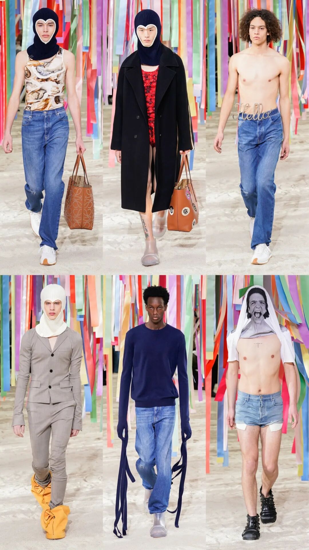 罗意威2022秋冬男装系列在艺术家 Joe McShea 和 Edgar Mosa 打造的场域装置中发布,创意总监 Jonathan Anderson 为本季打造的造型甚至比自己品牌的设计更加大胆和张扬:植入灯带的紧身衣、不规则廓形的衣装、有着超长手指套的针织衫、印着男性头像或裸体的T恤… 处处脑洞大开,充满惊喜。