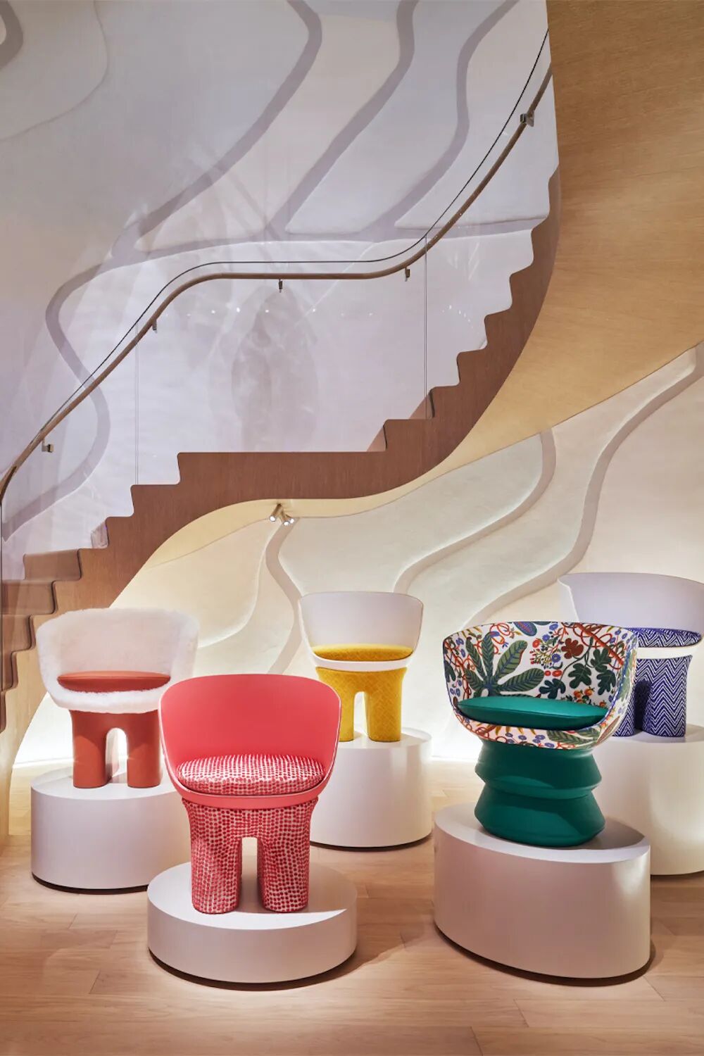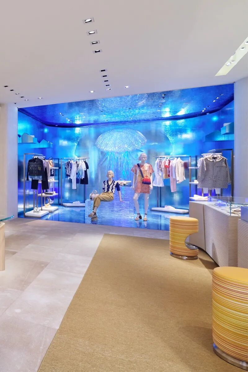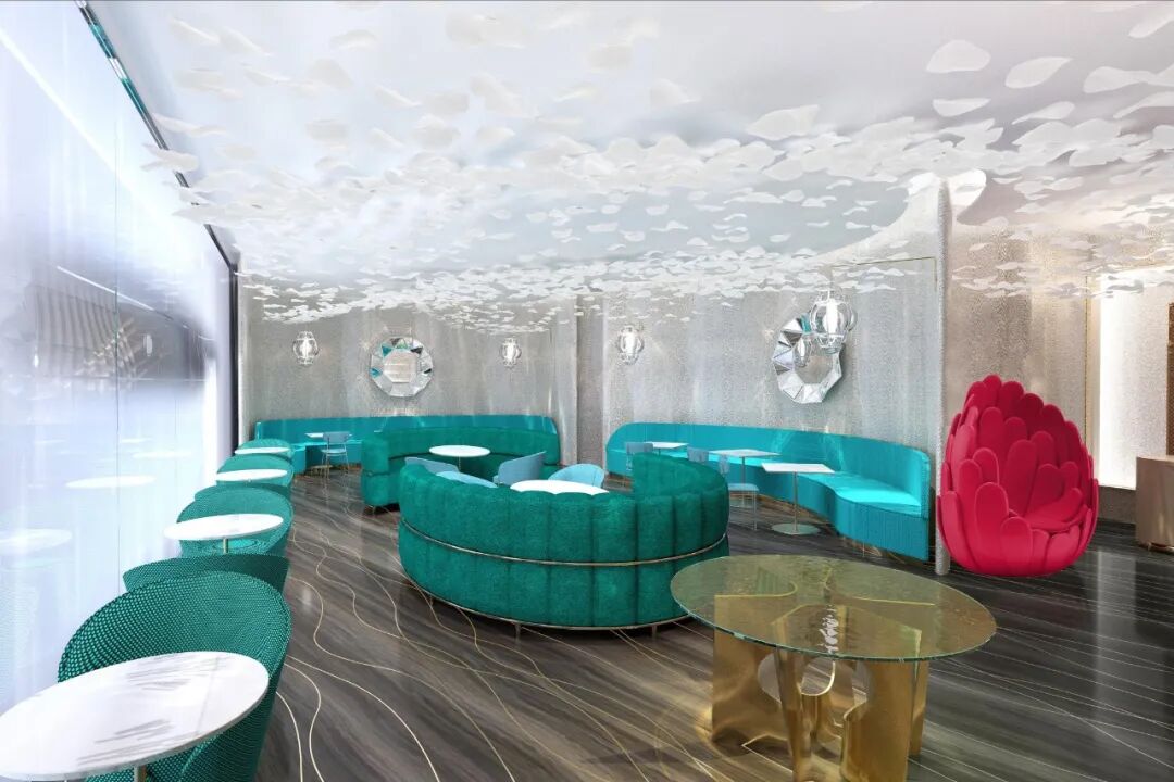 贵宾沙龙区也陈设了不少艺术家作品,每个区域都选择了不同款式的沙发、茶几、地毯组合,粉橘色、黄色的沙发搭配艺术感十足的茶几,共同创造出轻松高雅的休息区域。 而 Le Café V继续与大厨 Yosuke Suga 合作,第一家“ Le Café V”咖啡店于 2020 年初在大阪开张,作为 LV 的第二家咖啡店依旧十分精致,白色的纸张点缀着天花板,配合蓝色的沙发,延续了水的元素。