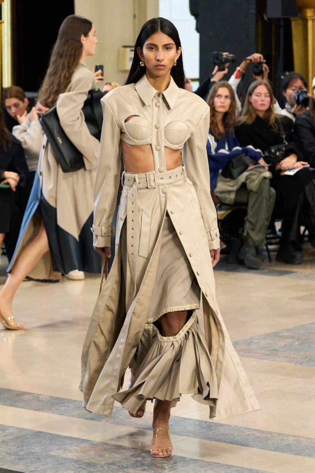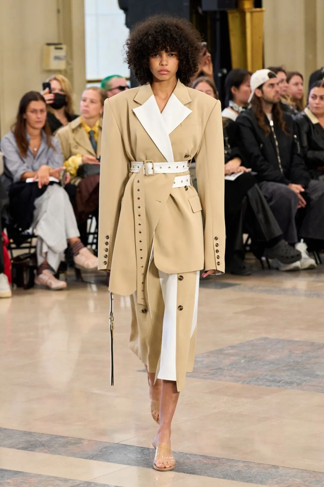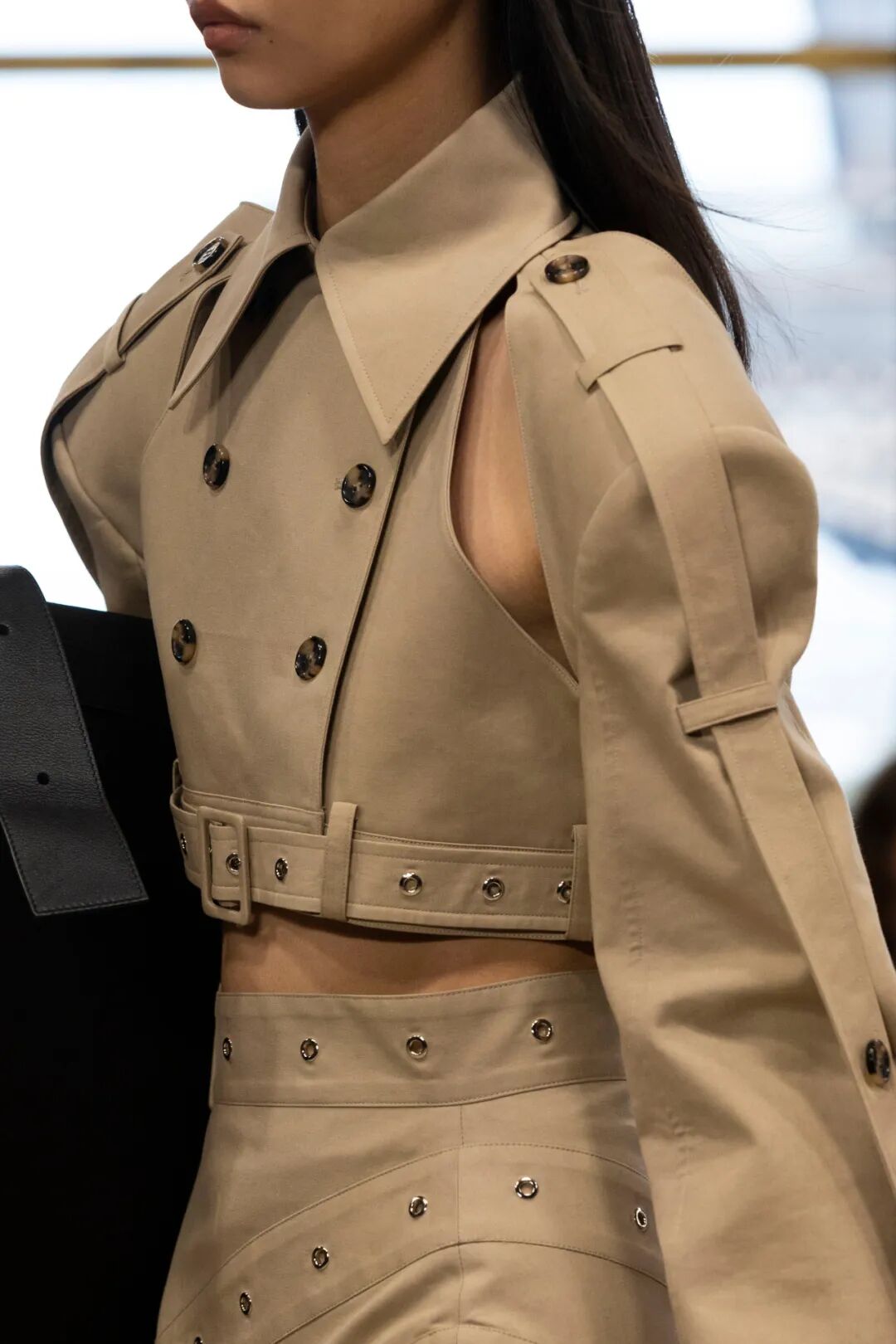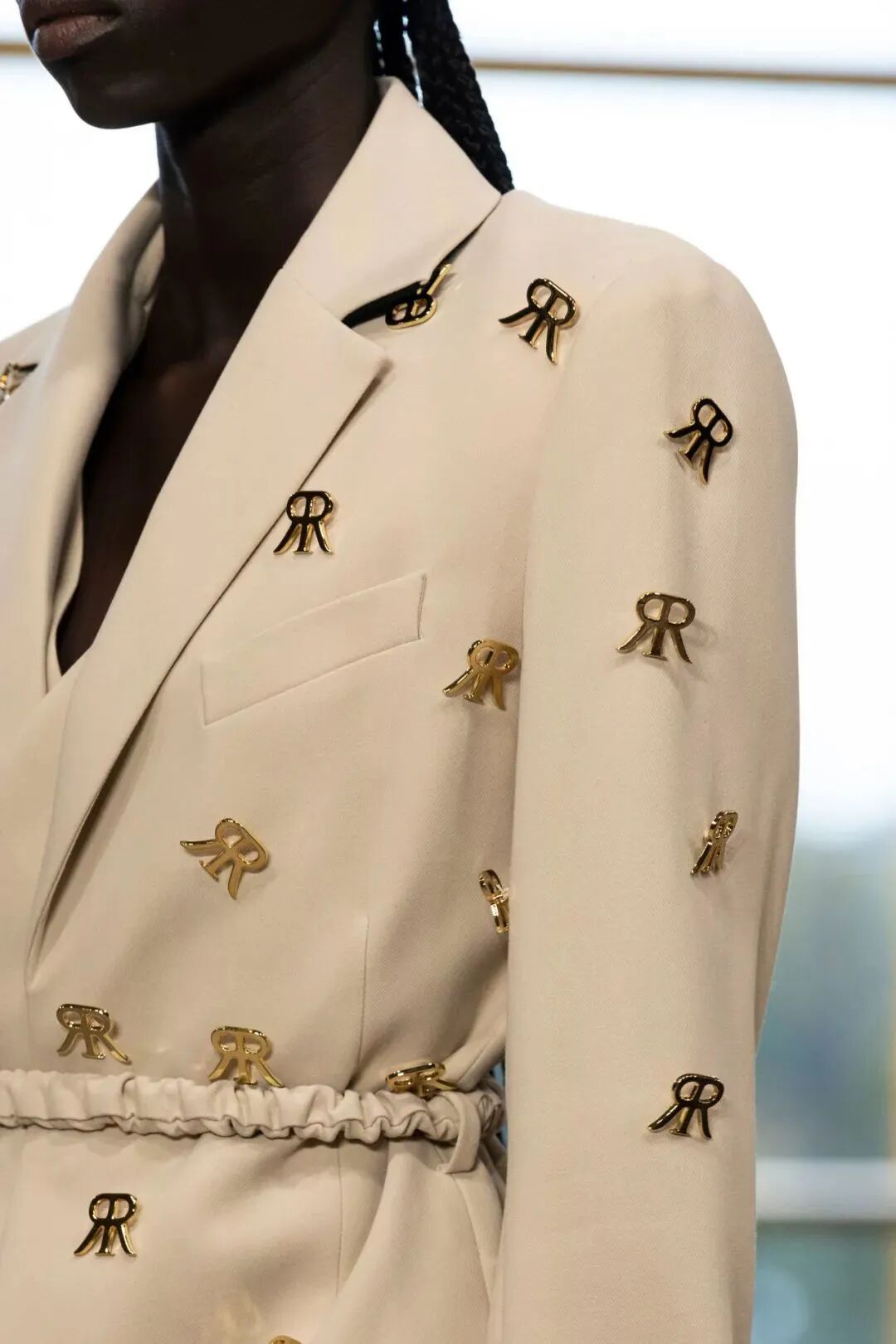 Rokh 2023春夏系列以「irrational view非理性观点」为主题,延续设计师最擅长的解构设计,将风衣重组成高腰裙和短款上衣的叠搭;或干脆剪裁成短夹克、贴身长裙。飘带、褶皱元素为整体增添有趣又优雅的装饰。
