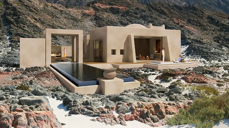 两间白马分别位于阿曼As Sodah岛(上图)和埃及阿斯旺(下图)的一座私人岛,前者是只有32栋500㎡+私人泳池别墅;后者的40栋私密别墅可俯瞰尼罗河,全数客舍标配直面阿迦汗三世陵墓的私人泳池。