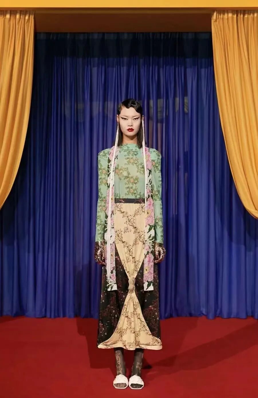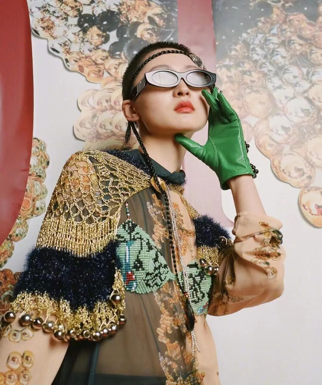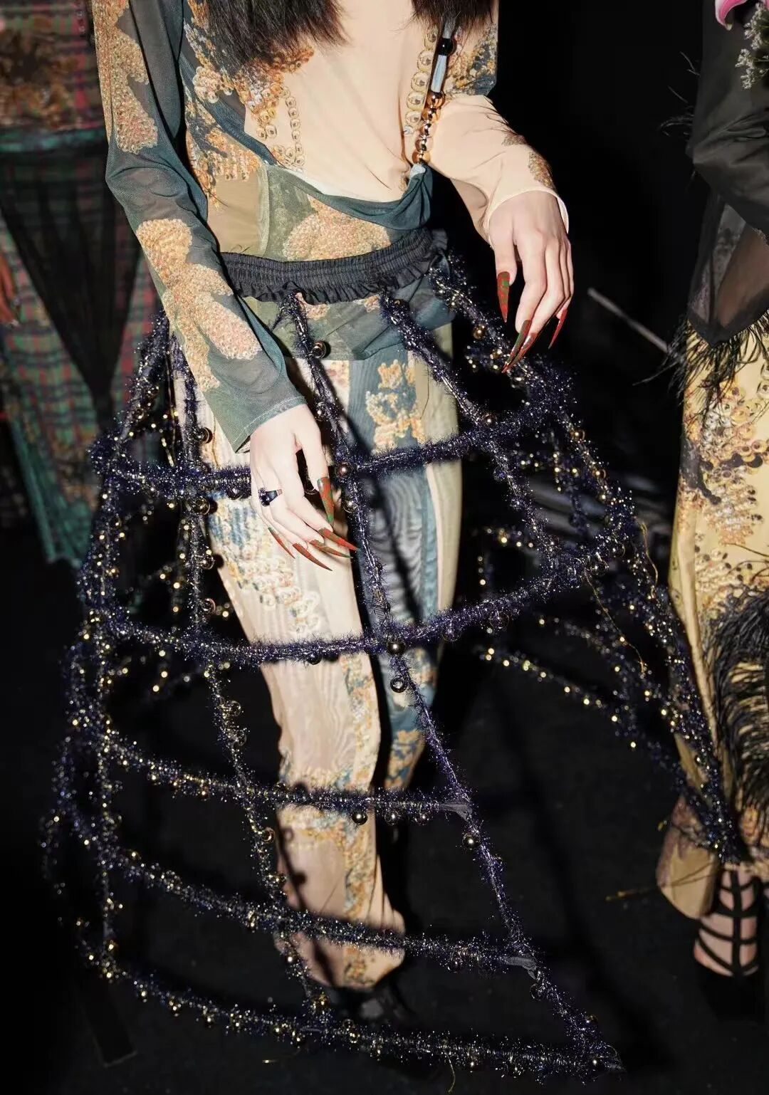 YUEQI QI运用大量的珠子编织和面料改造的技术,凭借独创的珠串梭织技术对传统与本能信念进行诠释,将中国传统元素中的浪漫与美感注入服饰之中,创造了一个风格迥异的女装设计文化。