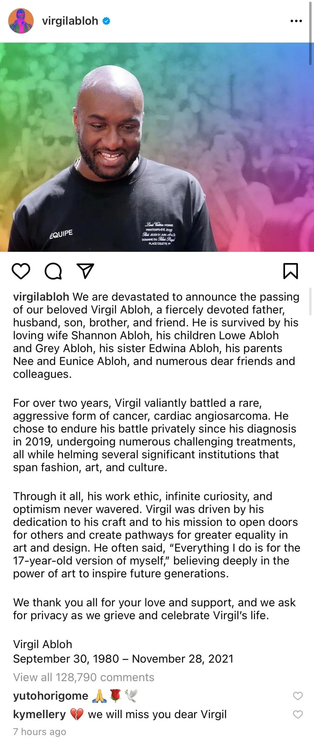 在过去的两年多,Vigil Abloh一直在与罕见的一种侵入性癌症战斗。2019年查出患癌之后,他选择向大家隐瞒病情,默默承担无数次挑战性的治疗,同时他也在时尚、艺术和文化领域的多个卓越组织掌舵。