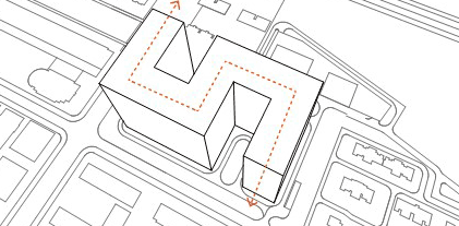 鉴于整体建筑体量庞大,为获取更佳日照条件,设计进行退台错动处理,建筑形体同时略微地扭转错动。处理后的建筑形体变得丰富而有趣味,整体形式上错落有致,并形成诸多露台绿化空间。
