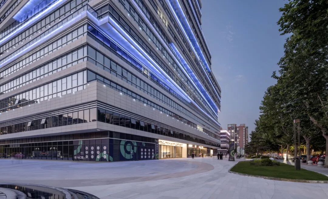 项目南侧为办公综合体,外立面采用银白色金属铝板与同一色系但透射率不同的镀膜玻璃,强调出建筑立面水平线条。