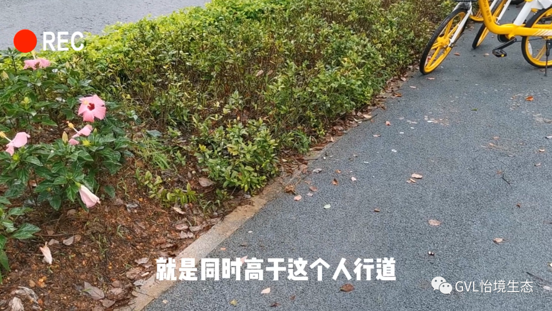 我们来看下这处机动车道与绿化带衔接的细节设计哈,这边有一个路牙开口,那么说明在设计的时候还是希望道路上的雨水可以通过路牙流进绿化带里面去的,但是我们看到,这个标高设计是完全不对的啊,绿化带的标高还是高于道路,雨水根本流不进去,所以哈,这里的积水还是很严重的,这样的海绵设施它的生态效益就消失了,因此我们应该意识到这个海绵城市建设当中标高的设计是非常重要的。