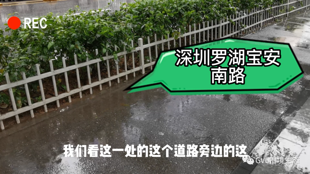 接下来,我们来到了深圳罗湖的宝安南路看一下,这一处的道路和绿化带衔接的地方,有很多的积水,为什么呢,主要还是这个绿化的标高是高于道路的,那雨水无法流到绿化带里面去,反而这个绿化带的水还会反冲到路面上,失去了海绵的作用,所以我认为还是要把绿化带整体按下去,这样可以帮助解决道路积水的问题。