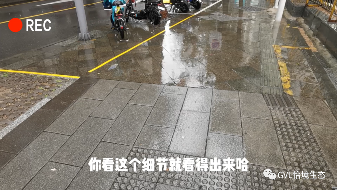 再者,下雨天这种花岗岩的地面还有个比较大的问题就是特别的湿滑,行人会有这个摔倒的隐患,走在这里要小心翼翼的,否则积水就会溅到身上,非常不友好。