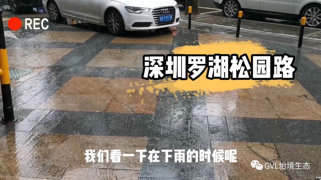 我们首先来到了深圳罗湖区的松园路看看,在下雨的时候呢,这些花岗岩的路面往往会产生非常大的雨水径流,铺装的表面上有非常多的雨水没办法及时排走,如果我们使用透水铺装的话,就可以缓解这样的雨水径流问题。