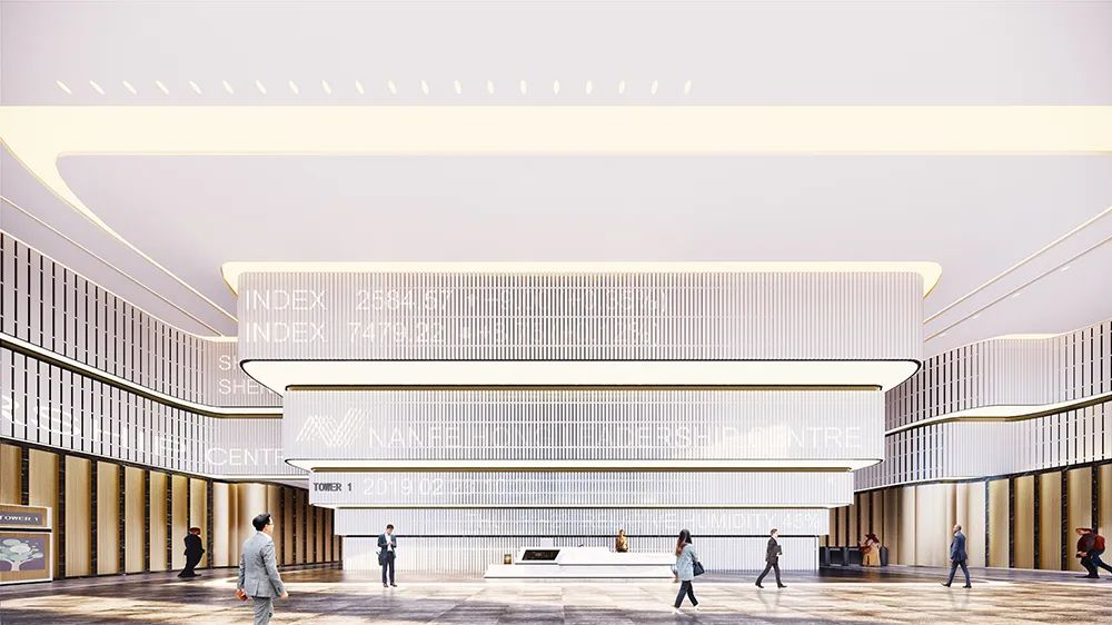 办公大堂设有特色LED屏,与商业裙楼立面相互呼应。立面造型横向展开,由上至下层层退进,营造出极具活力的办公氛围。