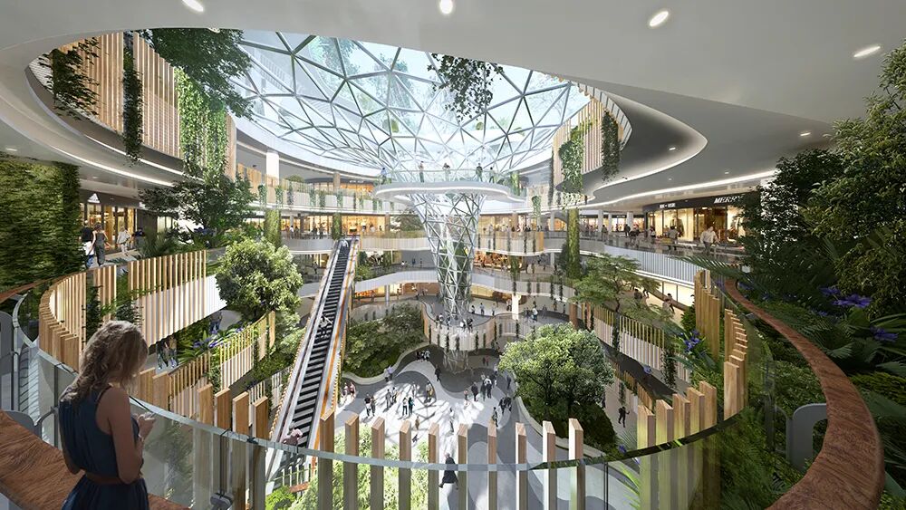 设计沿中庭打造了长条形天窗,将自然光引入商场,提升室内照明,从而减少能耗。室内的绿色植物也将改善室内空气质量,提升自然通风,营造出宜人的环境。