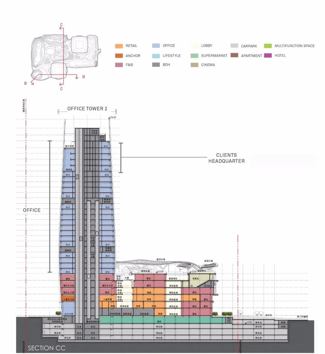 除了两座容纳办公和酒店混合用途的塔楼外,裙楼为商业业态,并设有屋顶花园,两者与塔楼之间彼此独立,又方便可达。