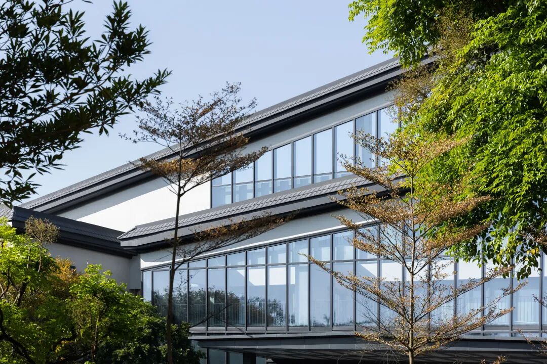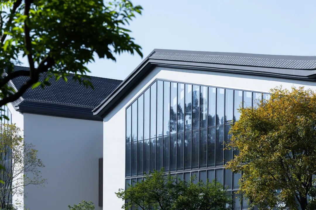 建筑主体采用浅色涂料,恬淡朴素,使建筑轻盈,不沉闷。窗间用挺拔的深色铝板加以提炼概括,并点缀格栅,虚实结合,突出重点。