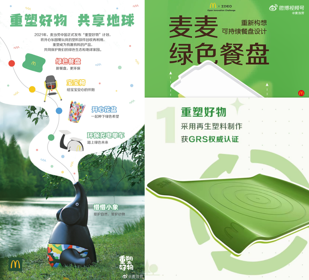 麦当劳自2021年起正式在中国发布“重塑好物”计划,将开心乐园餐玩具的塑料部件回收再利用,重塑成有趣的产品,为保护绿色生态做出贡献。