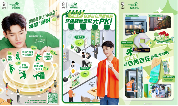 作为一直以来秉承#自然自在#的品牌可持续发展理念的品牌,除了倡导节约粮食的肯德基食物驿站之外,肯德基还开设了多家“肯德基创绿先锋店”参与节能环保,并推出线上“小绿店”倡导低碳生活,不断拓宽公益边界,带动消费者一起践行绿色生活方式。