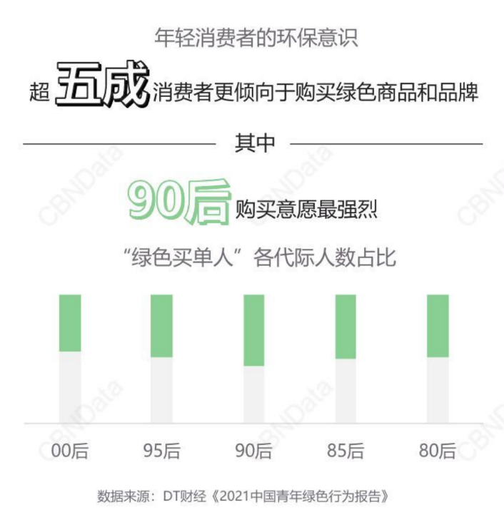 与此同时,随着人们认知水平的不断提升,越来越多的消费者也开始在消费习惯上倾向于绿色环保品牌。根据《2021年中国青年绿色行为报告》显示,年轻消费者的环保意识越来越普遍,超五成的消费者更倾向于购买绿色商品和品牌,“绿色买单人”群体呈壮大趋势。