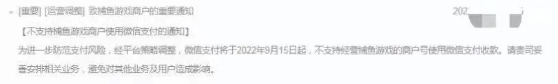 据悉,从8月起,就有捕鱼小游戏从业者陆续收到微信平台提示,为进一步防范支付风险,经平台策略调整,微信支付将于9月15日起,不支持经营捕鱼游戏的商户号使用微信支付收款。目前,支付宝尚未对捕鱼游戏收款做出限制。