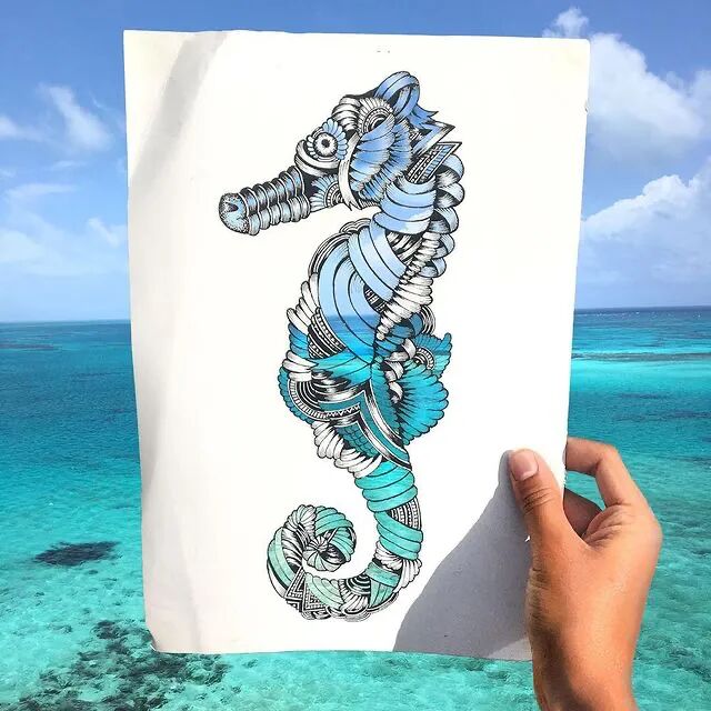但是这一系列作品的特别之处在于,手绘完成后的作品,被艺术家进行了镂空雕刻,这一操作完成之后,费伊·哈利迪将黑白的镂空手绘画作,从纸上剪下来,拿到户外的环境中,神奇的一幕就发生了,画作的镂空处,透出了天空、大海、夕阳的颜色,黑白的画作一下子被上了色,并且色彩非常和谐,让人感叹,这也太奇妙了。