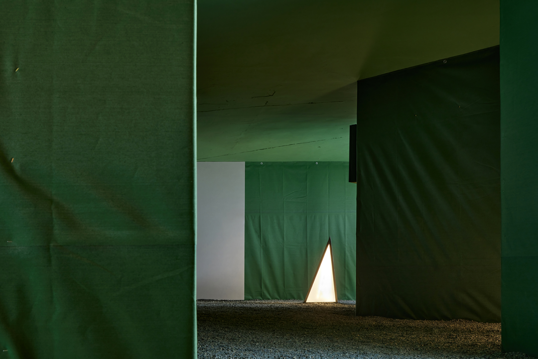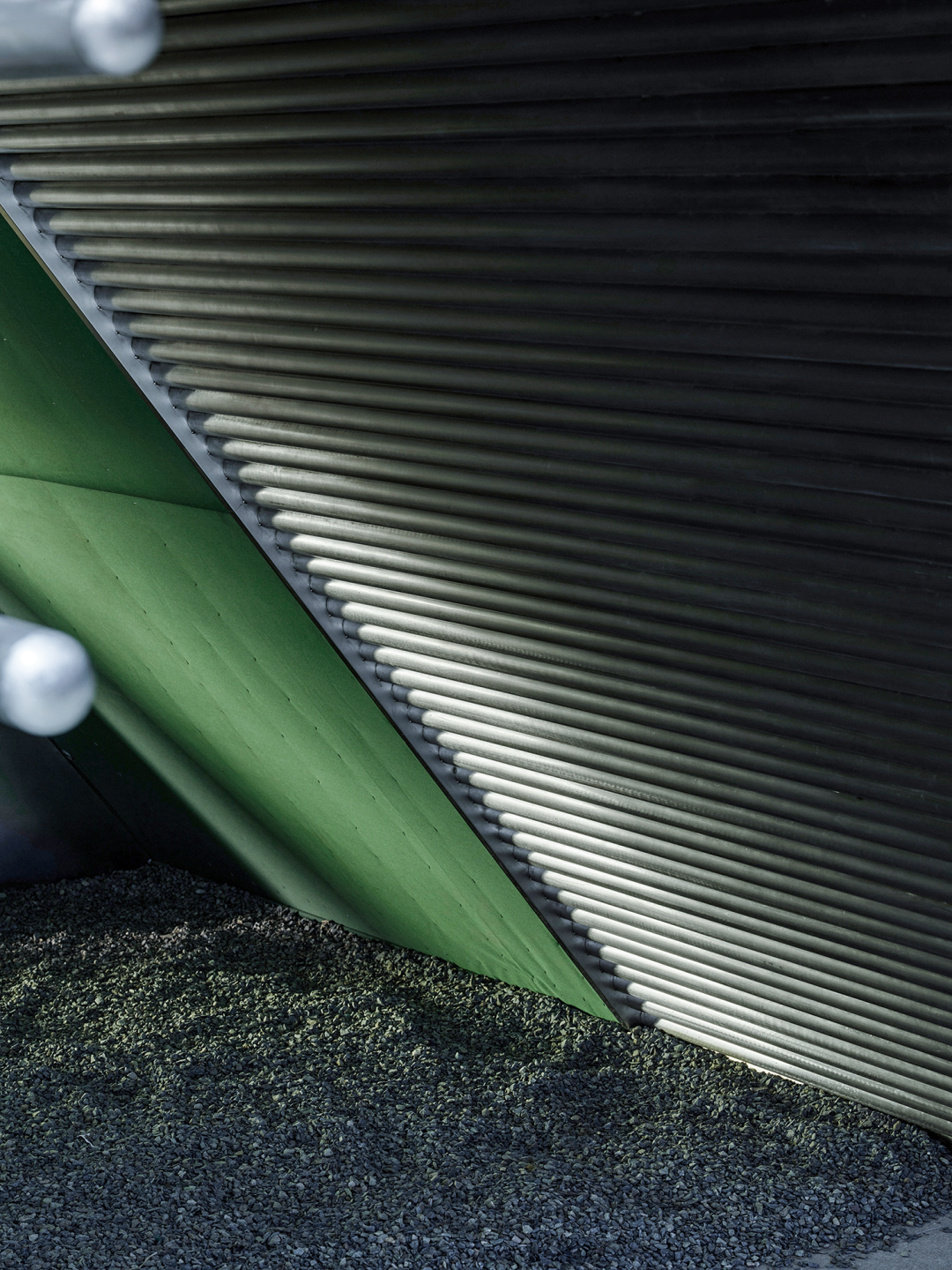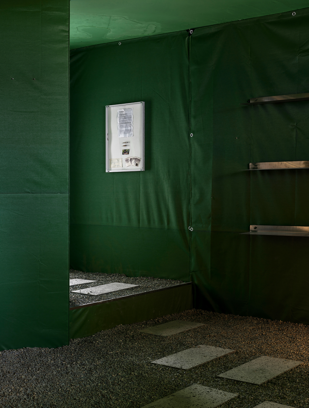遵循再利用既有资源的可持续理念,耐磨防水遮阳的工业帆布包裹外立面和内部墙体,施工安装中以钉枪缝合加固连接节点。吊顶覆盖简单环保的水性漆,地面直接铺设黑石与汀步,模糊室内外的界限。回收金属管搭建的三角装置作为唯一的显性标识,指引“巢穴”的入口。