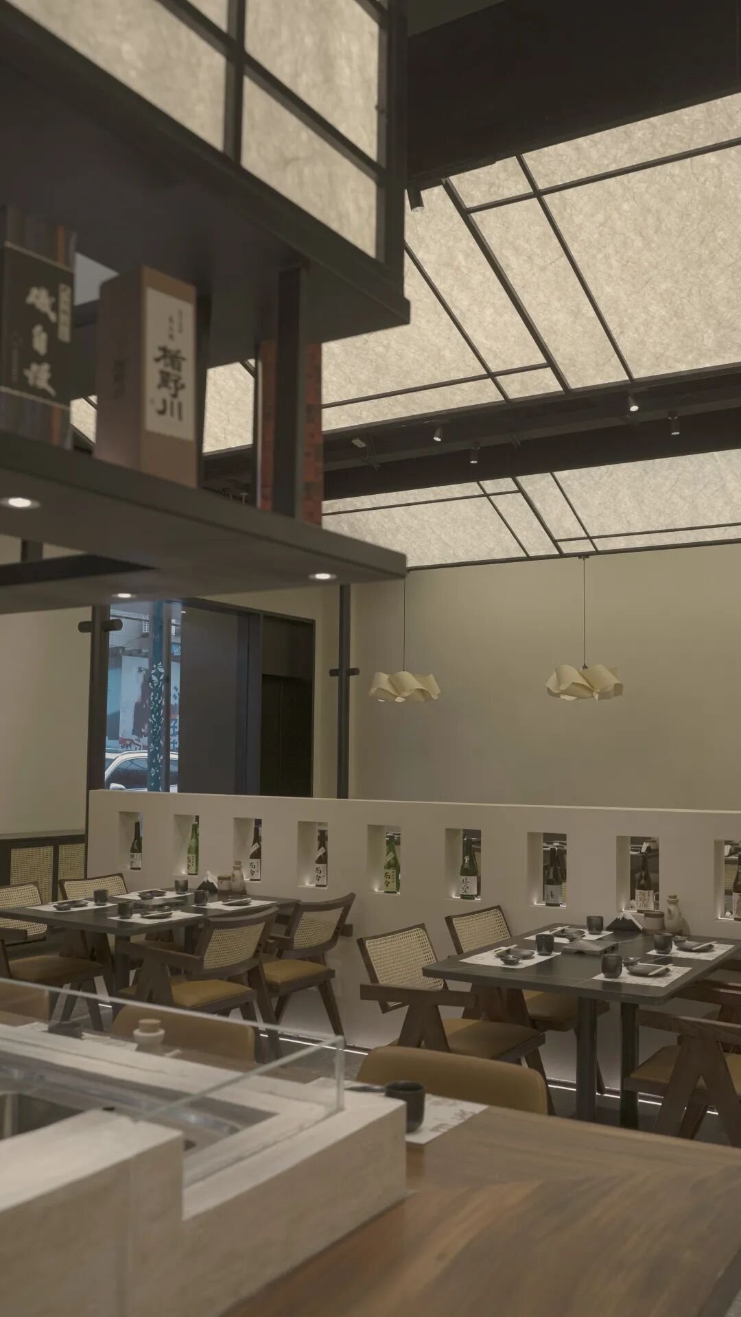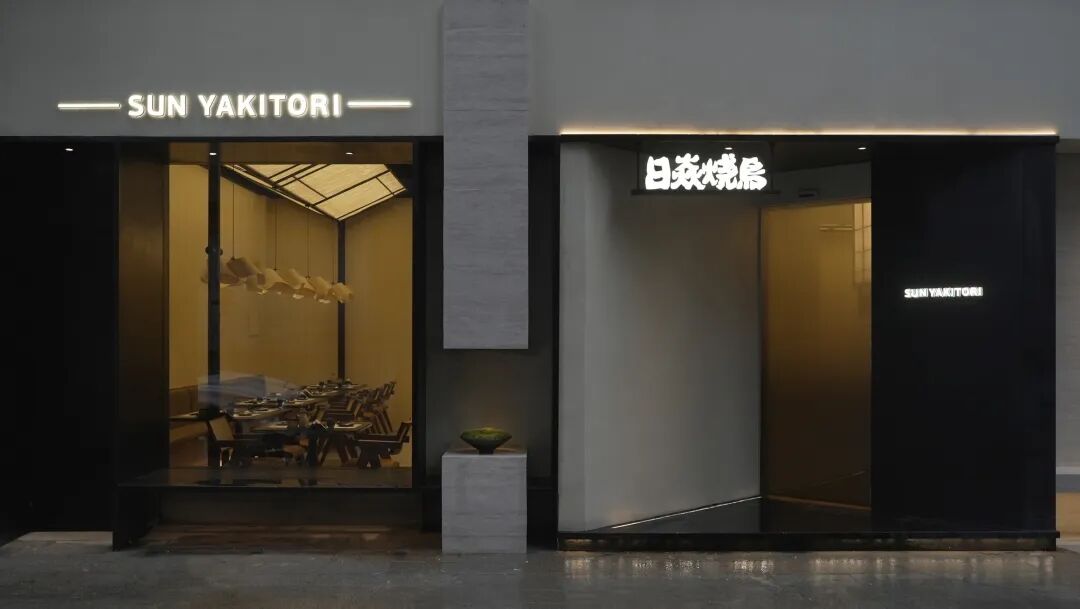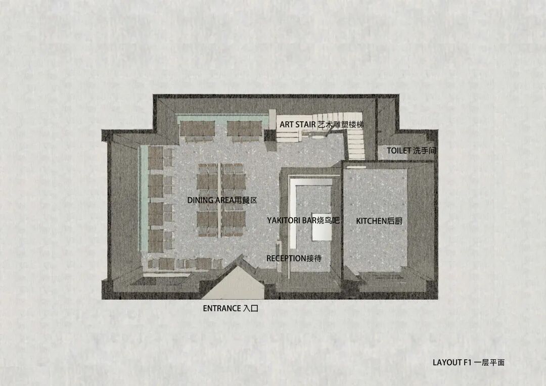 一楼主要是堂食与厨房区域,烧鸟很重要的一点,是厨师与客人的互动。倒一杯酒或切一片生鱼片,递给客人的这个动作,是很重要的画面。设计师对此把烧鸟吧台放在了平面的中心,无论是进门所见,还是通往二楼的通道,都需经过吧台。让视觉上充满烟火的弥漫,让嗅觉上吸收食物的香味。