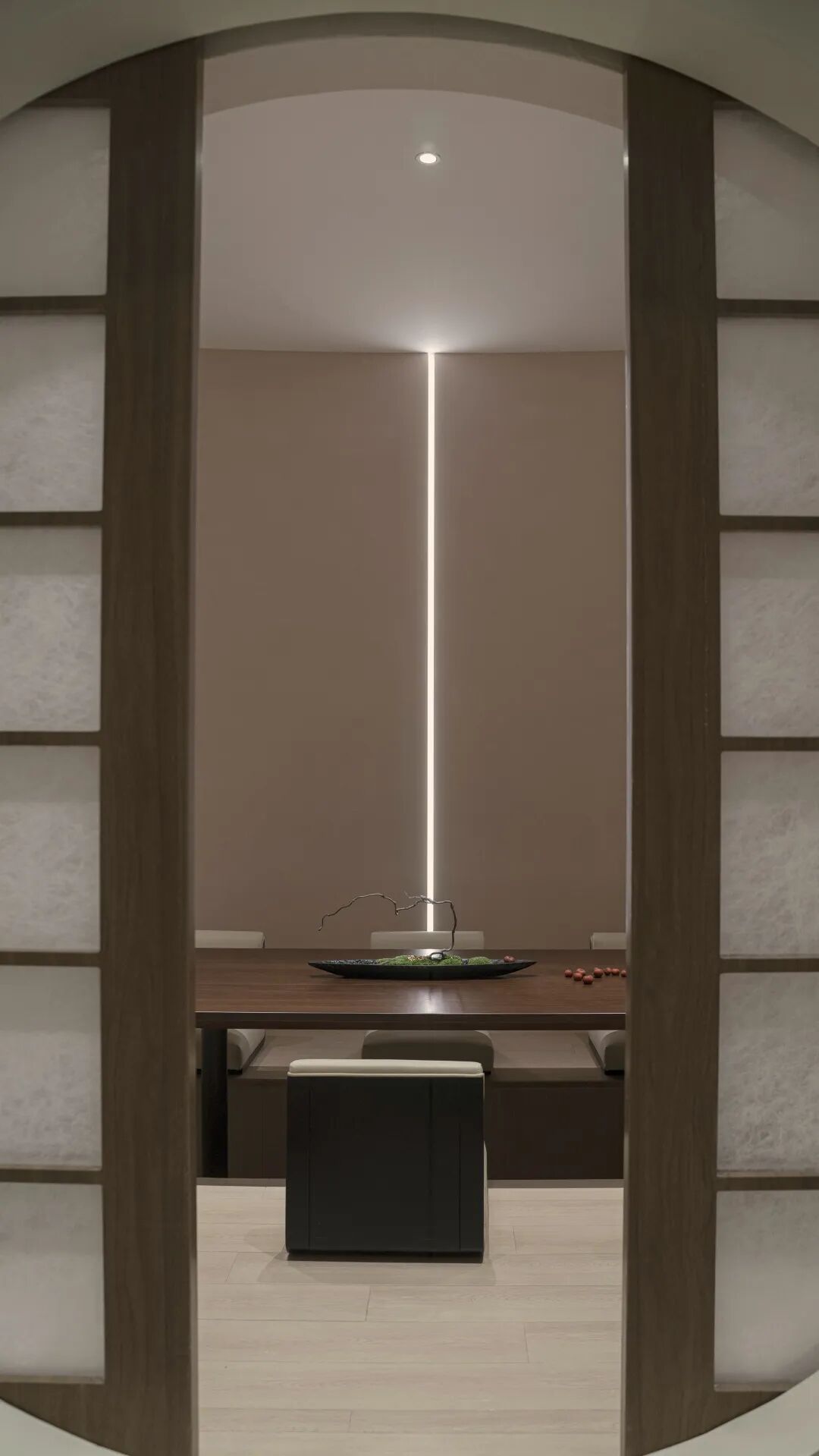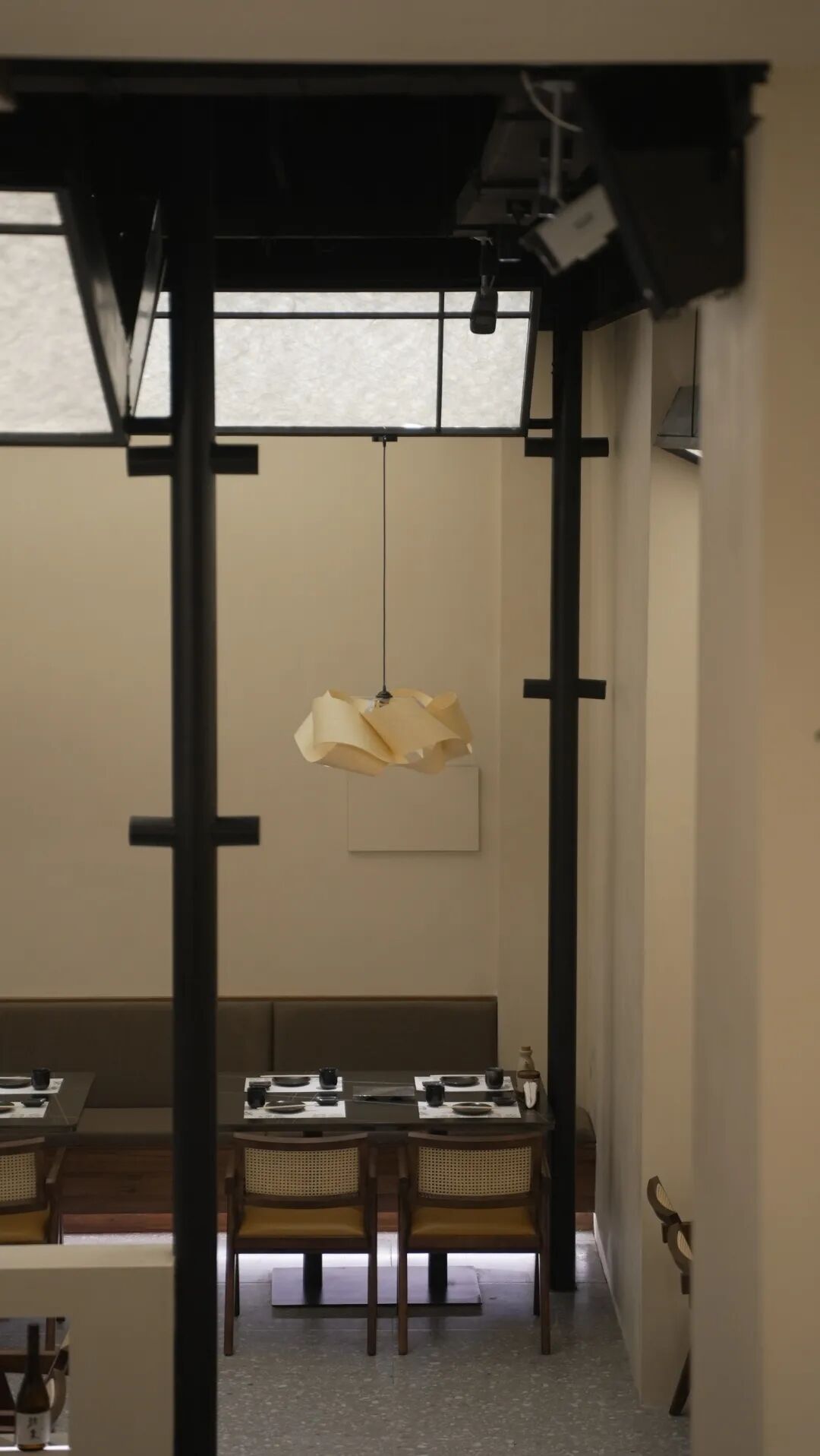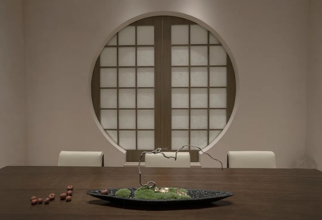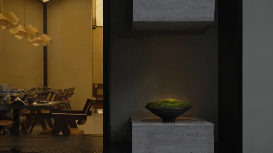 二楼分布着一个6人小包间和一个10人的大包间。小包间设计成一个精神空间,踏着黑色的炭烤实木,进入圆形的透光门栅后,正对着是个半弧形的墙体。墙面四周质朴的微水泥环绕着,一束光从天到地。席地而坐,或许可以闭上眼睛,期待着美好食物的到来。