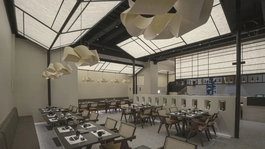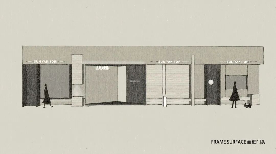 设计师对于现场周边环境的分析与室内功能的划分结合,把外立面通过画框的形式分别框出了座位区、入口、以及厨房区域。同时将入口内推并且倾斜45°角,朝向主街道,这样不单解决了风水相冲的问题,也满足了餐厅空间的需要保持部分私密与开放性的属性,并且让整个外立面具备很强的艺术体块感,有利于店铺的识别度与传播性。设计师同时考虑到了社会属性,后厨的外墙通过十字架构,形成了户外的厨师歇息长凳,也可以满足客人打卡与社区邻里休息。