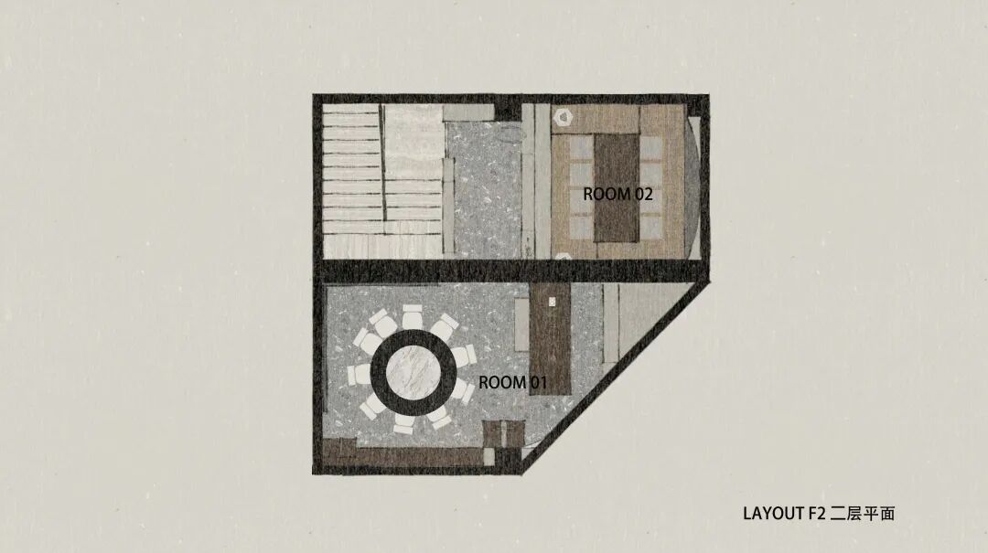 由于层高与一二楼重叠区域的限制,楼梯被设计成分段式,一段直跑加一段U型。在扶手的设计上也做了石材与钢板的分离式设计,通过不同体块的分离让通常单调的楼梯扶手更加具有趣味与艺术感官。同时,也形成了空间的一个转化的过程,让客人在上楼的过程,从美学感官到心理上有一定的升华,又为楼上的空间铺垫一定的遐想。