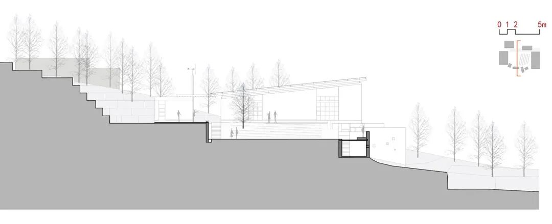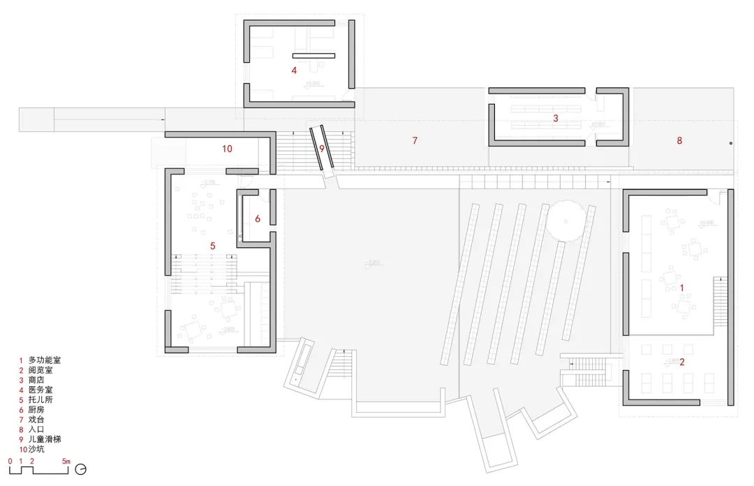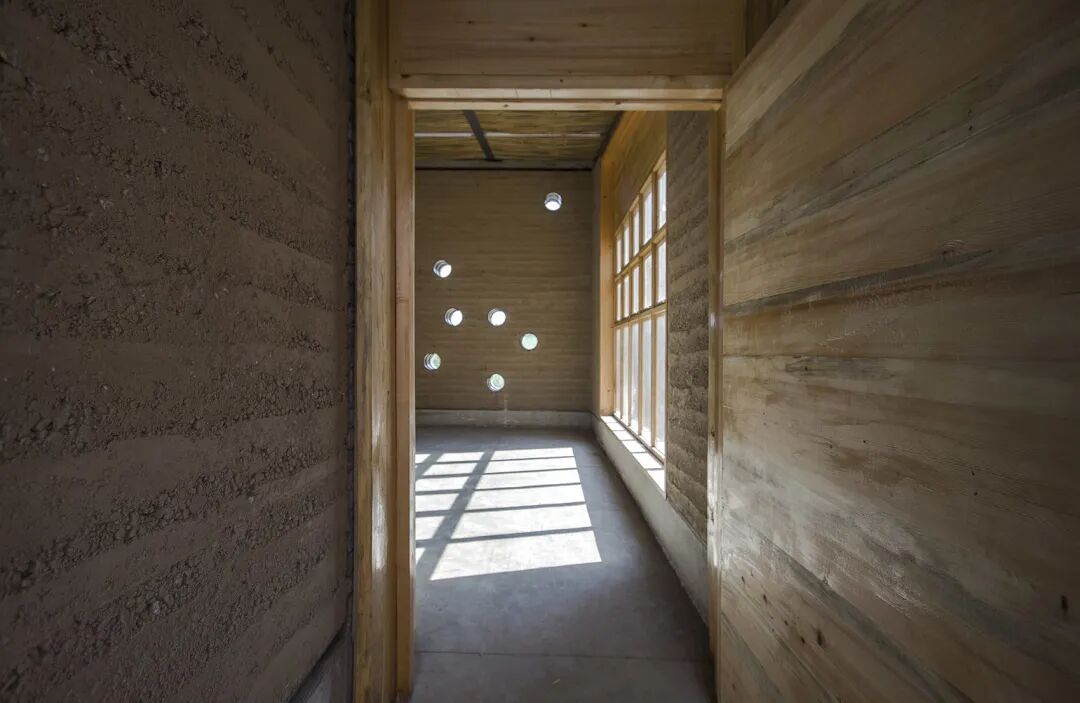 中心利用一片面东的坡地,空间功能被设置为一个开放的可供集会与看戏的场院和四个相对独立的土房子:多功能室、商店、医务室和托儿所,除满足马岔村民日常公共生活服务需求外,也是该地区推广现代生土建造技术的培训基地。