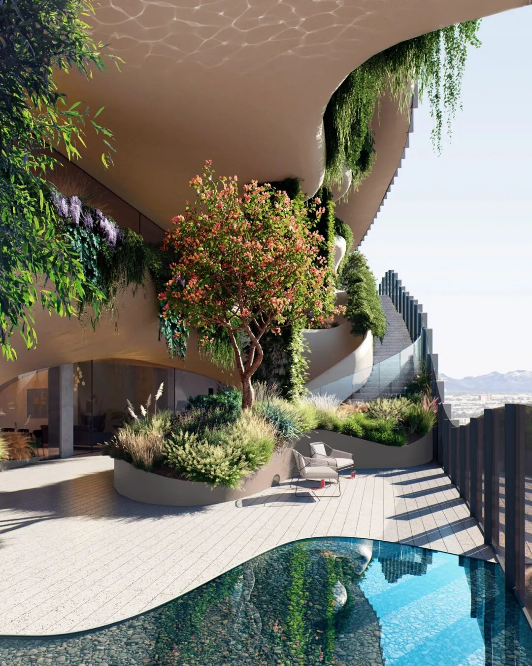 住宅塔楼由玻璃覆盖,最突出的特点是其稍微弯曲的体量正面有一系列切口,被项目团队称之为“景观美化的裂缝”。