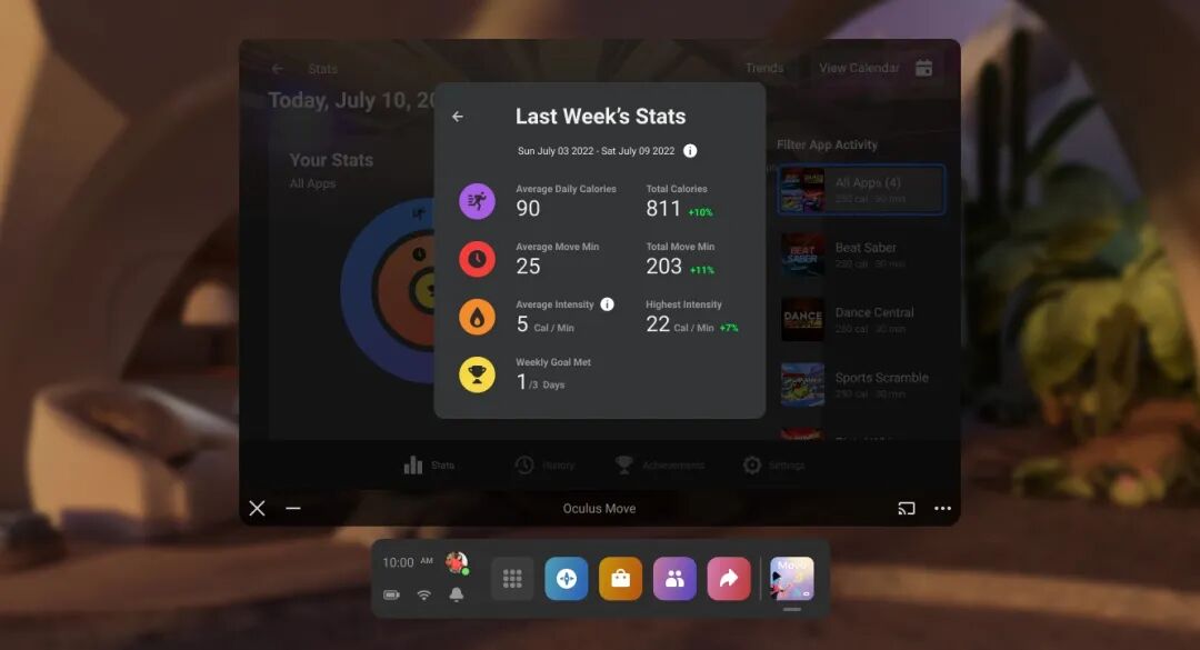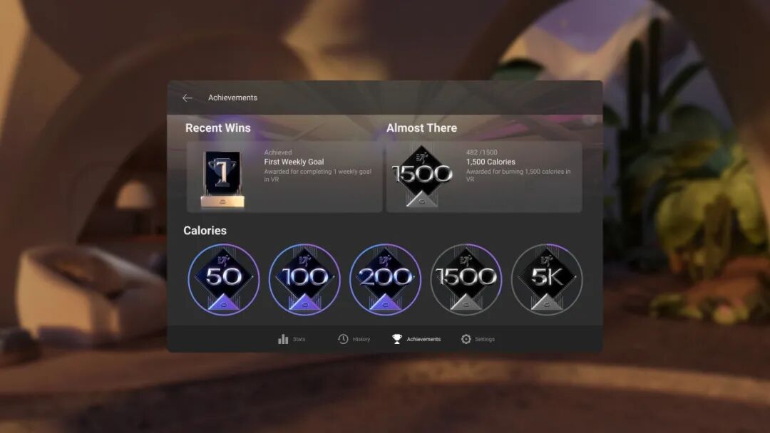 更新后,Oculus Move增加了对智能手机的支持,内置的Quest健身追踪器将在V42中增加一个新的成就功能:运动成就,如根据总卡路里的消耗将达成不同等级的成就,此外还有其他短期目标,如每日和每周的目标,完成100个每日目标也能达成成就。