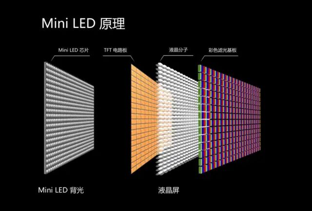 Mini LED 具有高画质、低功耗、寿命长的优点,灯珠小型化之后,可以比 OLED 更轻薄,在亮度、残影等方面的表现优于 OLED。