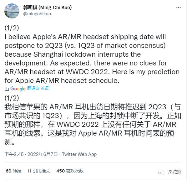 分析师郭明錤预测,由于受到新冠疫情的影响,苹果头显产品的出货日期将会推迟到2023年第二季度。
