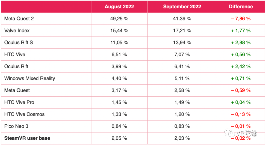 Valve公布的最新一期SteamVR数据显示,Meta Quest 2的市场份额环比上月下降了7.86%,而一些旧的PC VR设备,如Oculus Rift(2016年)、HTC Vive(2016年)、Oculus Rift S(2019年),Valve Index(2019年)却有明显上升趋势。