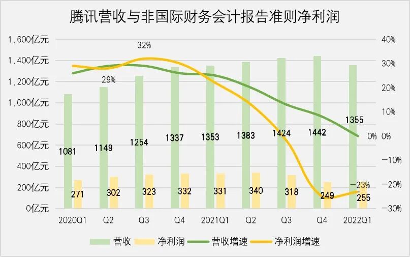 5月18日,腾讯发布2022年第一季度财报,数据显示一季度营收1355亿元,增速与去年基本持平。非国际财务会计报告准则下,净利润255亿元,同比下滑23%。