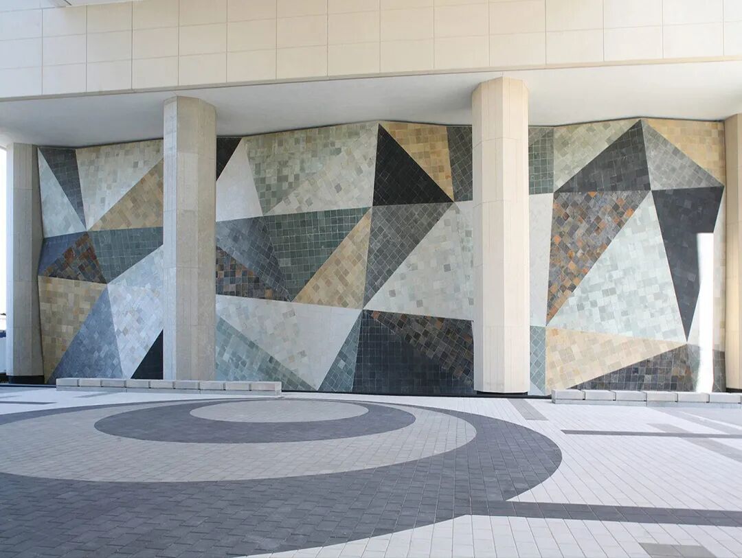 而在室内,马赛克式的肌理被延续,墙面以彩色瓷砖拼贴出折纸般的视觉效果。