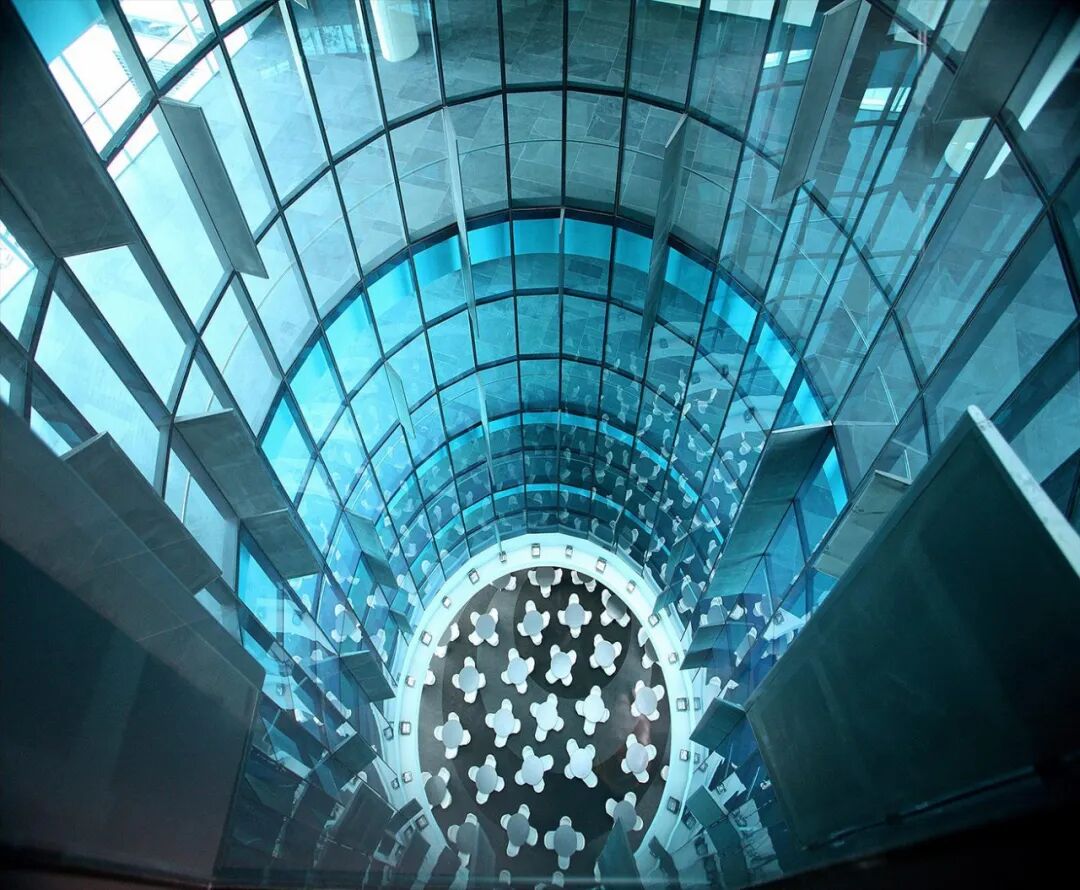 圆锥形的玻璃中庭从七层到屋顶逐渐收缩,形成了一种不断变换的视觉效果——站在其中,多重反射的光线仿佛让人置身于光的漩涡。