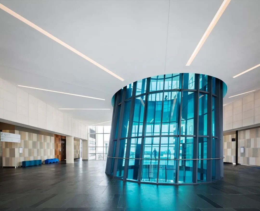 沿着建筑南北轴线,弧形玻璃体量将两大功能区域连接起来。而在中央位置,一座7层楼高的纪念性中庭倾斜插入,创造出一个极具象征意义的标志性空间。
