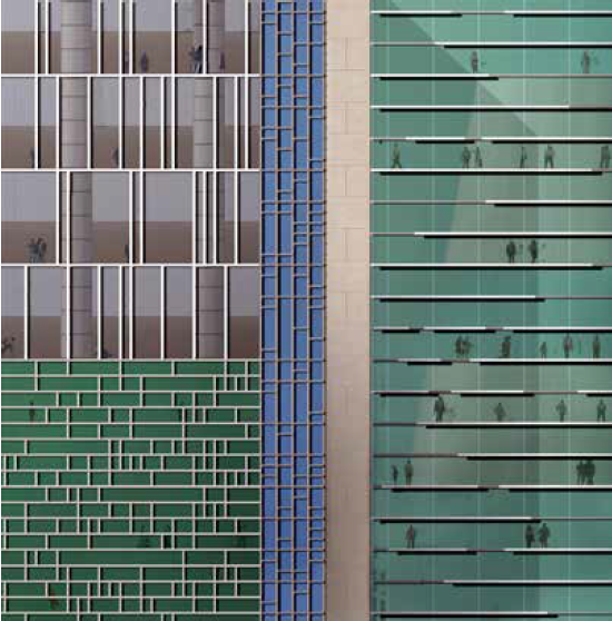 建筑立面由玻璃幕墙与疏密有致的竖梃共同组成了杂色的网格——较低的楼层采用横向的、更密集的线条,较高的楼层则采用竖向的、更分散的线条——由此划分出不同的图案,宣告建筑内部的不同功能。