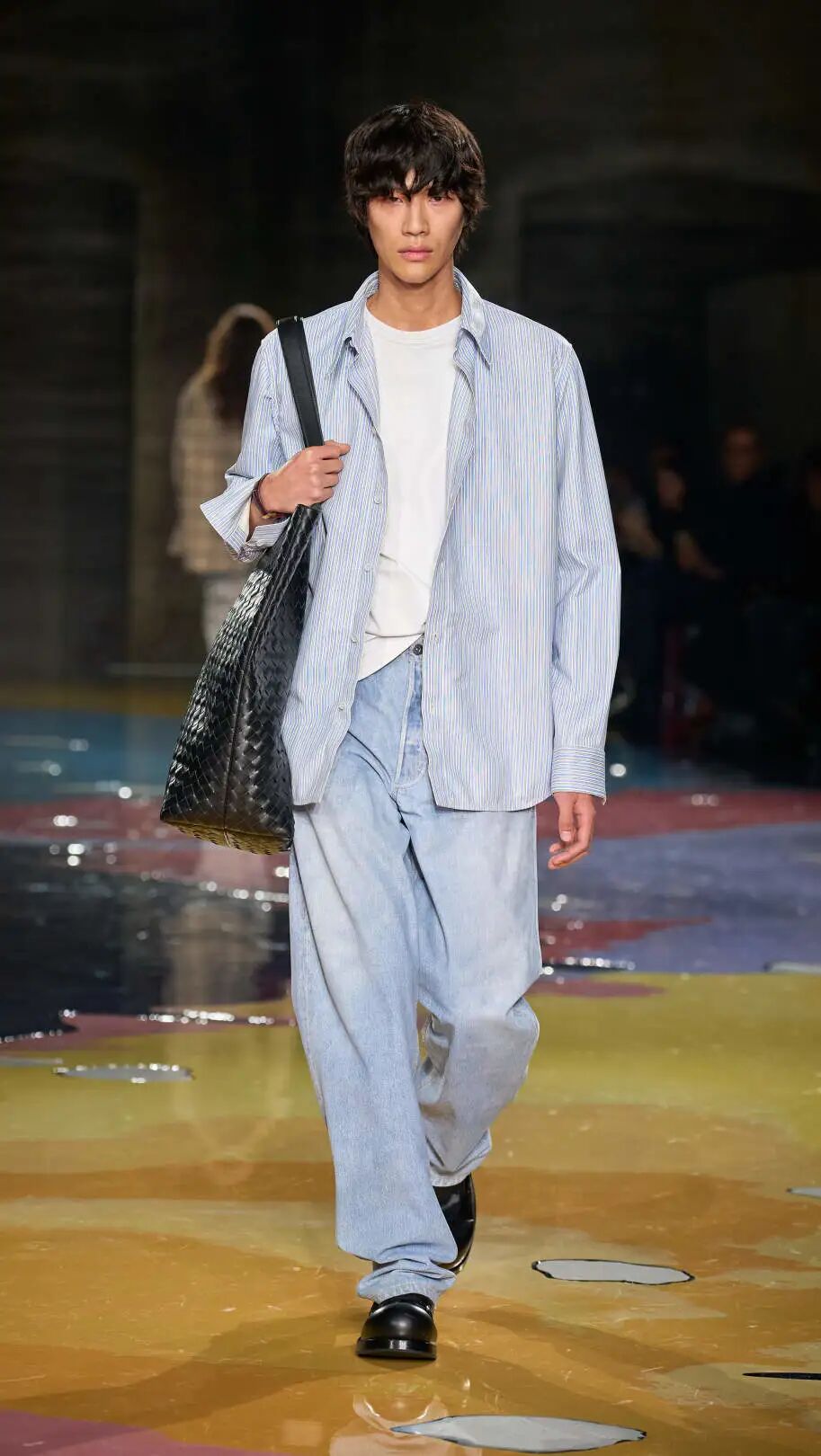 到了2023年春夏,Matthieu Blazy重拾Bottega Veneta的DNA,围绕皮革和编织重塑“老钱”(Old money)形象。模特身穿格子、条纹印花的衬衫和牛仔裤走出来,内搭简单的纯棉白色T恤。