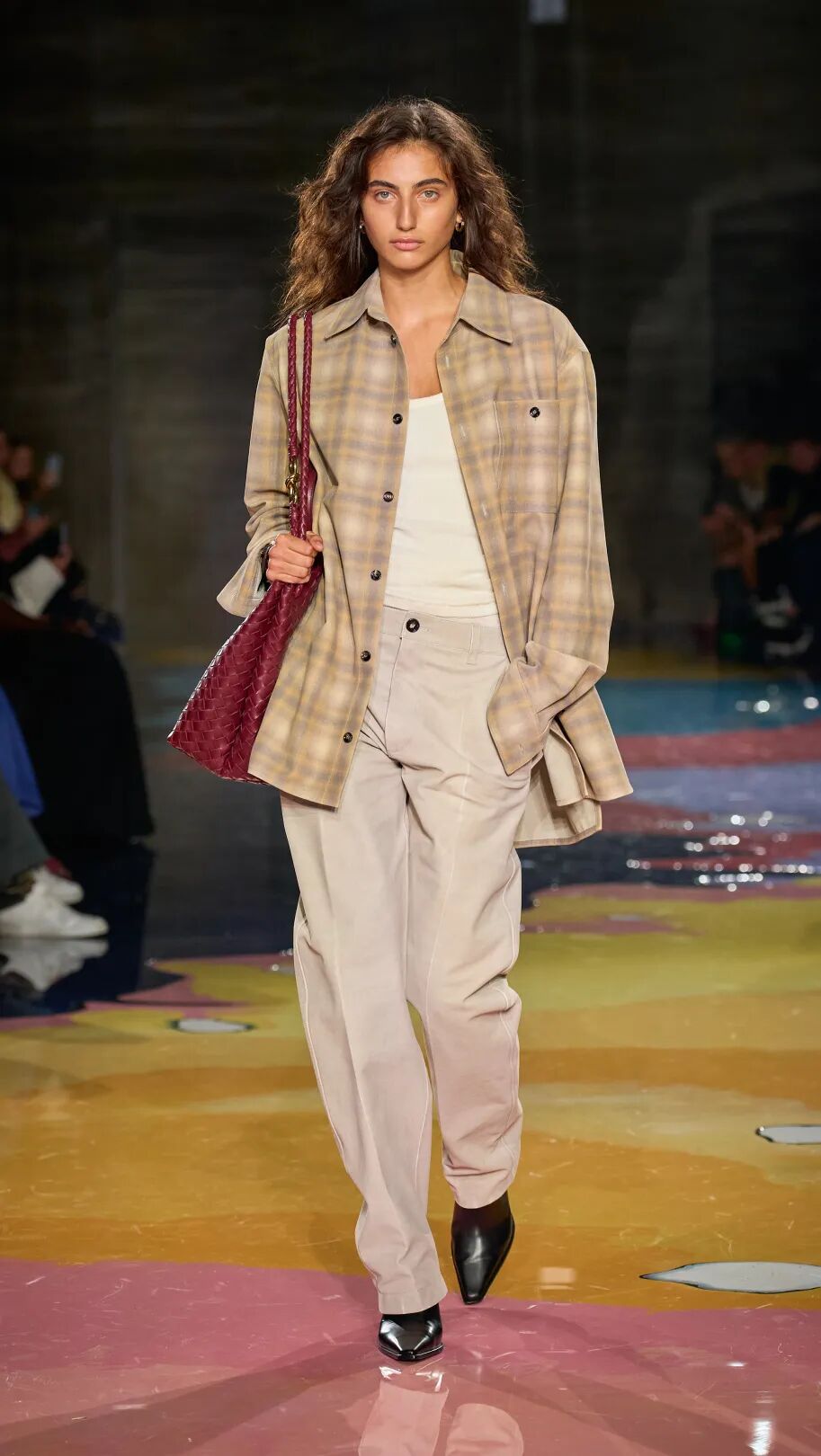 在Matthieu看来,白色T恤、衬衫和牛仔裤都是可以穿到天荒地老的单品。好了,那要如何把最寻常的单品做到极致?他把Bottega Veneta的条纹衬衫、格子衬衫和牛仔裤,都用皮革来做。