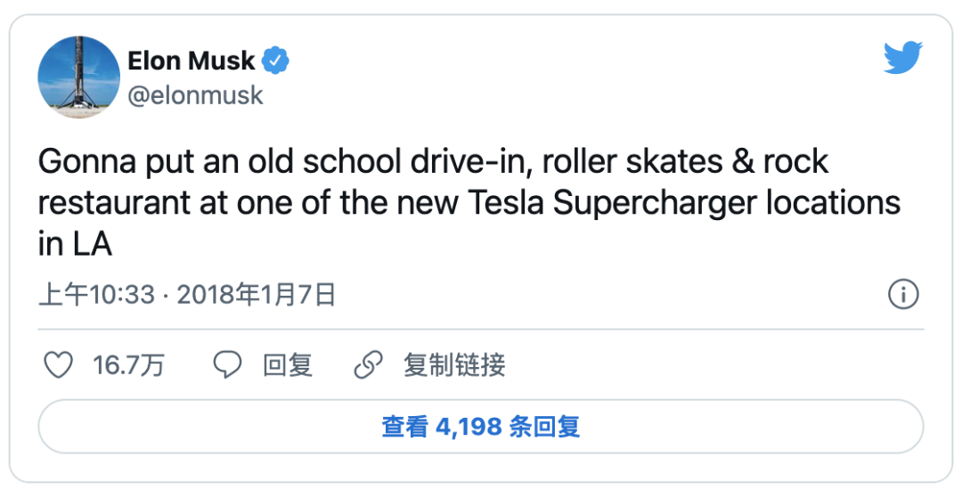 而后2018 年,马斯克直接在推特上表示:要在洛杉矶的超级充电站建设一个老式汽车餐厅,要有有穿旱冰鞋的服务员和摇滚乐。后来还戏言特斯拉餐厅可以用狗狗币支付。