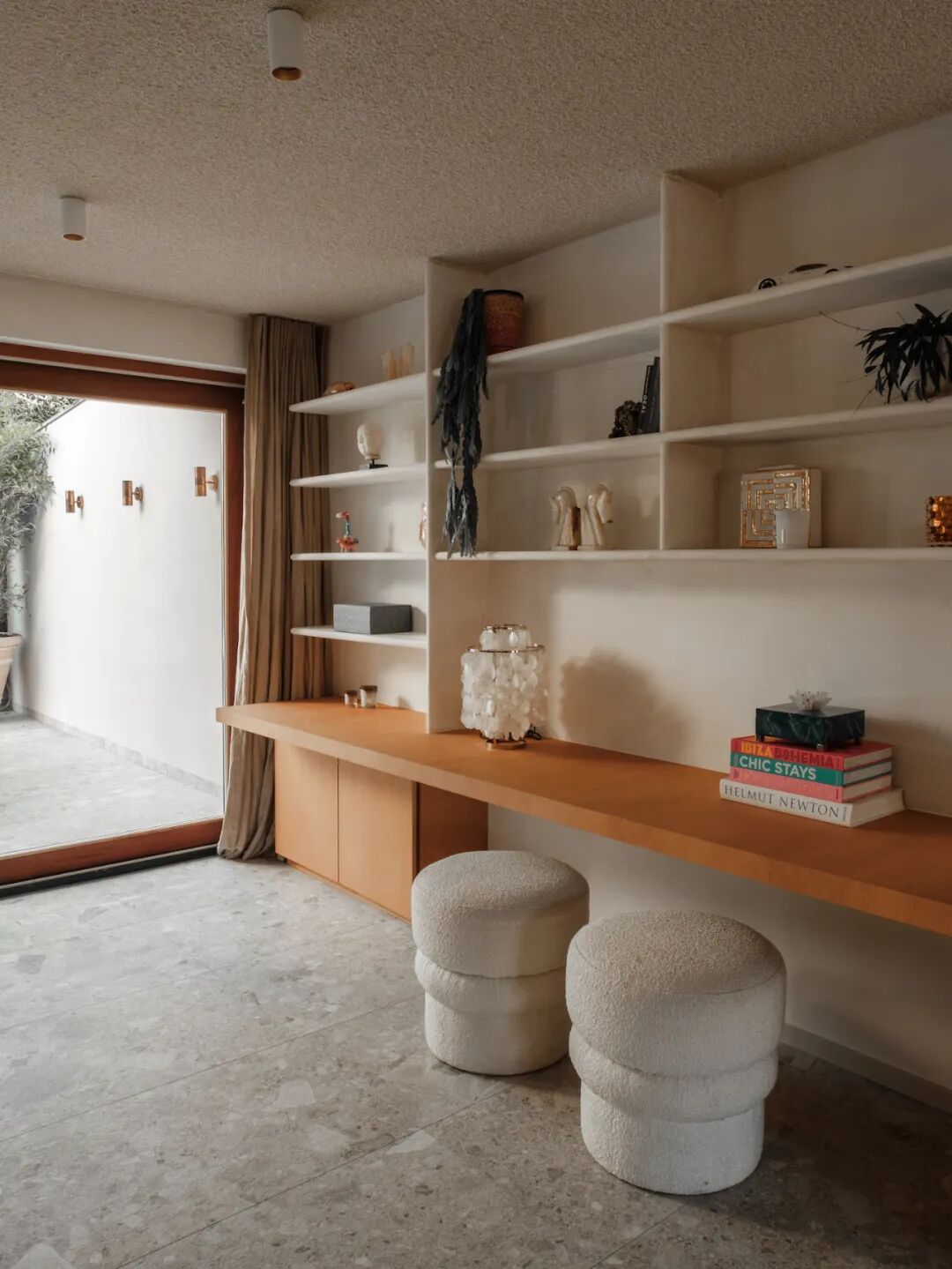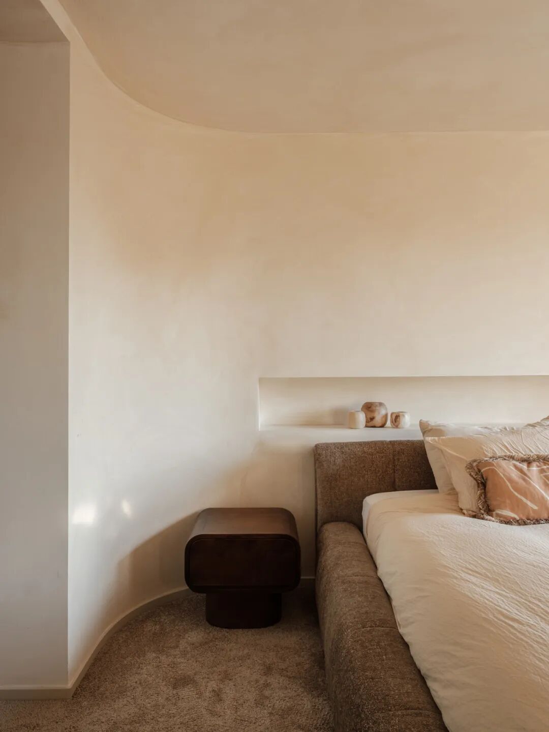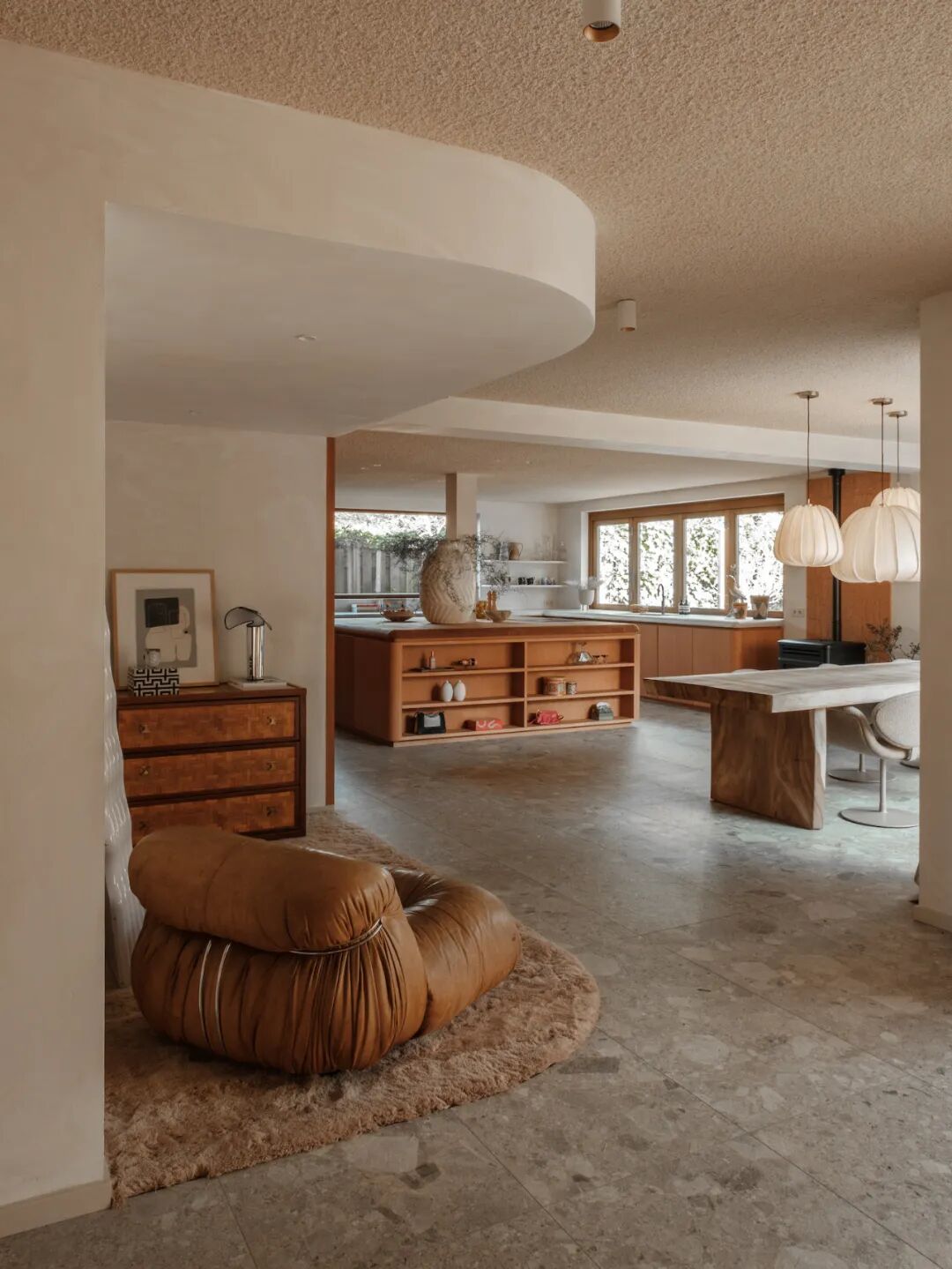 The application of plaster and microcement reflects the European context of the Eindhoven house and accentuates the broad curves that soften each space. Carpeted floors in the living room, bedroom and walk-in bathrobe create a peaceful retreat, while upholstered furniture invites tranquility. In keeping with the common areas, the bathrooms are clad in the same tiles as the common areas, with copper fixtures and mid-century style cork joinery.