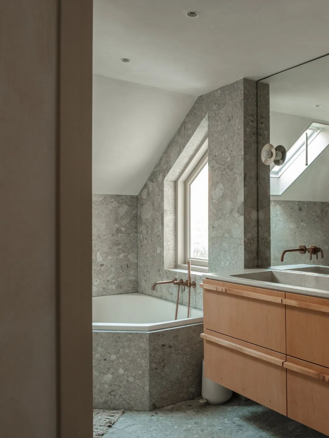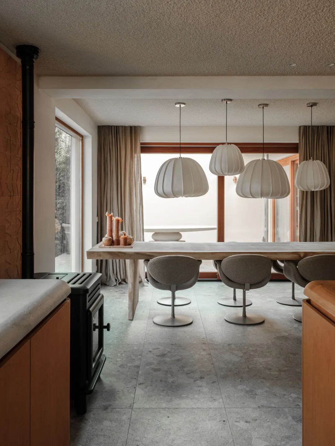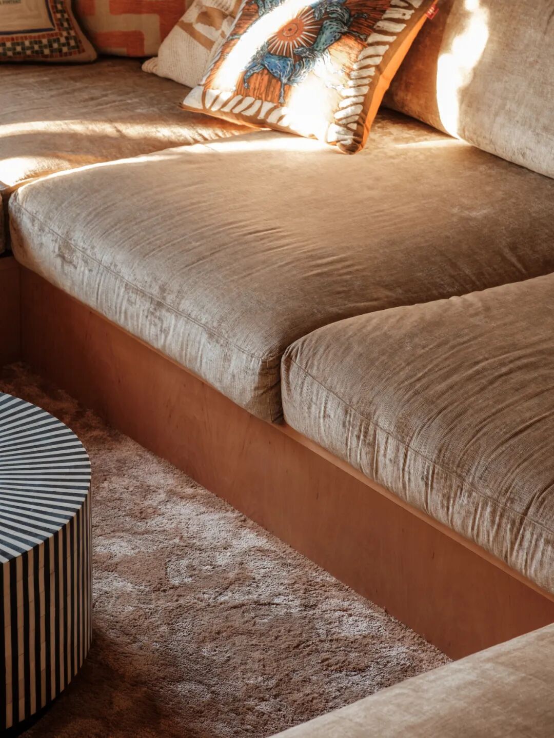 The application of plaster and microcement reflects the European context of the Eindhoven house and accentuates the broad curves that soften each space. Carpeted floors in the living room, bedroom and walk-in bathrobe create a peaceful retreat, while upholstered furniture invites tranquility. In keeping with the common areas, the bathrooms are clad in the same tiles as the common areas, with copper fixtures and mid-century style cork joinery.