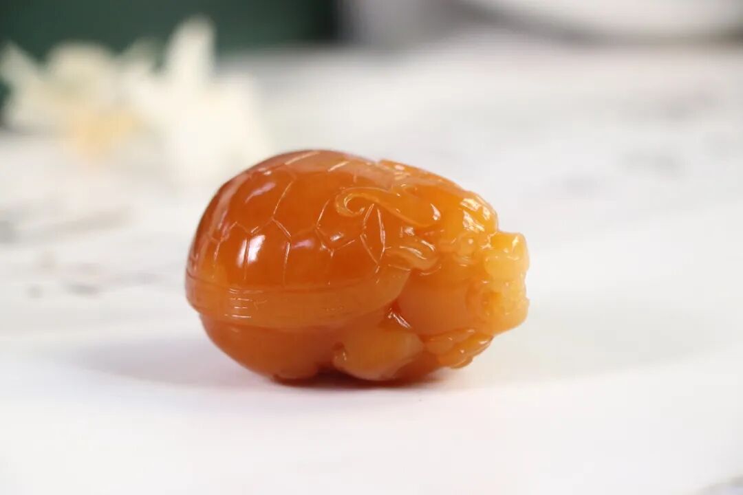 在民间,人们一直把龙龟封为长寿吉祥的象征。由于〝龙龟〞与〝荣归〞同音,所以龙龟也代表“衣锦还乡,荣归故里”。玉雕中常见的龙龟造型,尽量饱满高背,通常龟甲的高度要大于宽度。