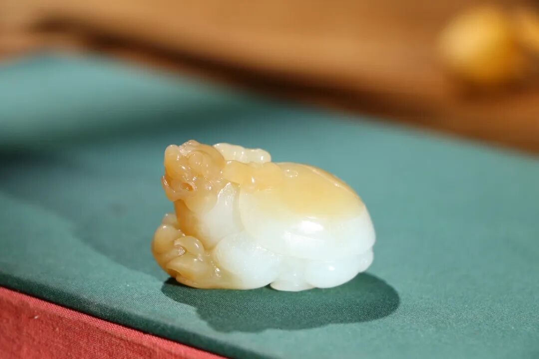 自此,仅剩下三条腿的金蟾臣服于刘海门下,为求将功赎罪,金蟾使出绝活咬进金银财宝,助刘海造福世人,帮助穷人,发散钱财。人们奇之,称其为招财蟾。玉雕中常见的三足金蟾造型主要有:含钱金蟾、元宝金蟾等。
