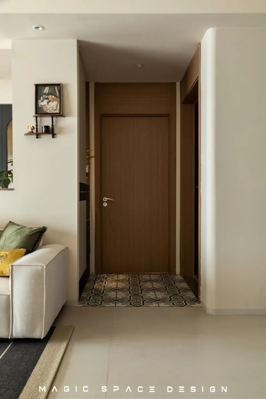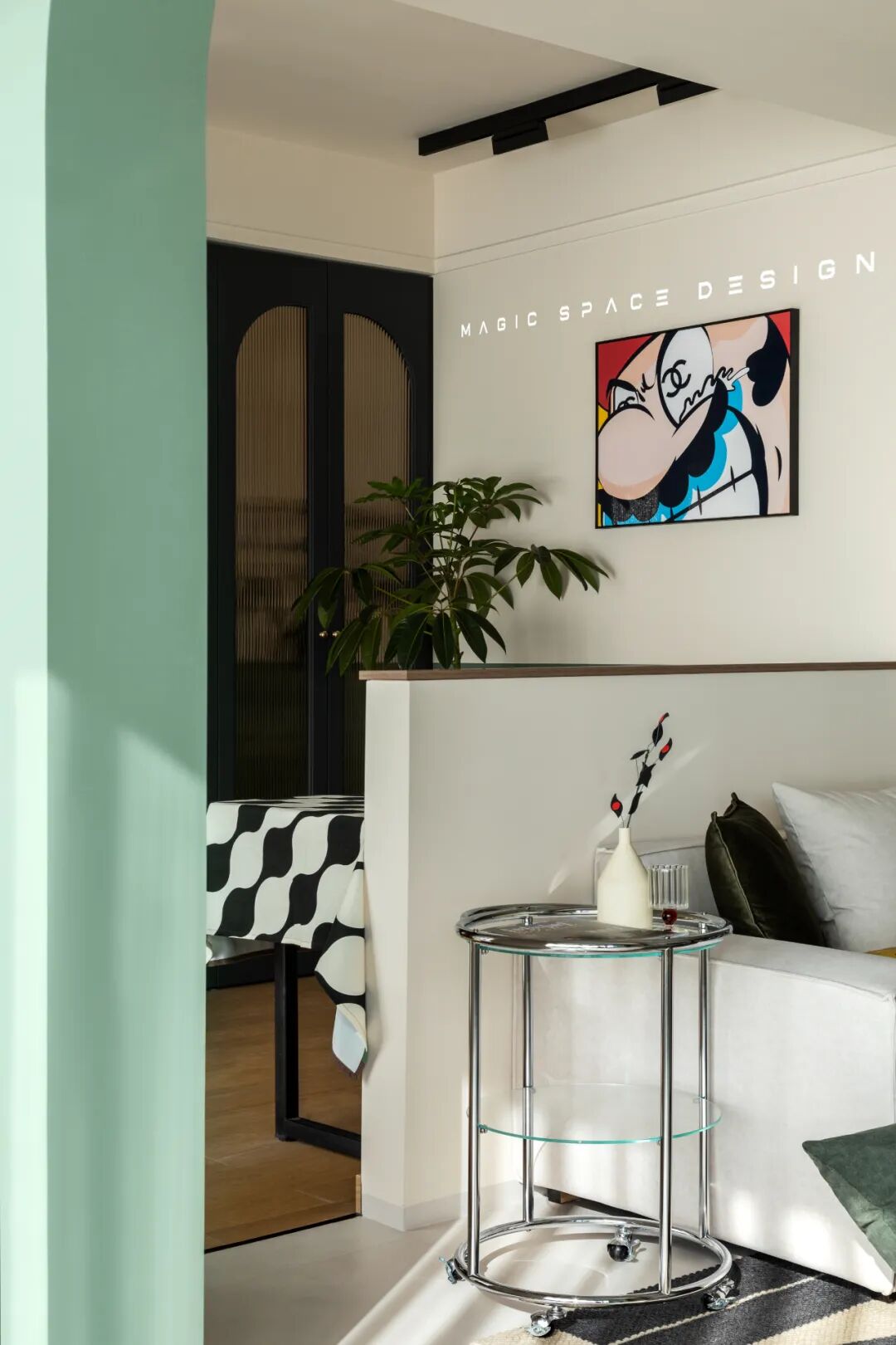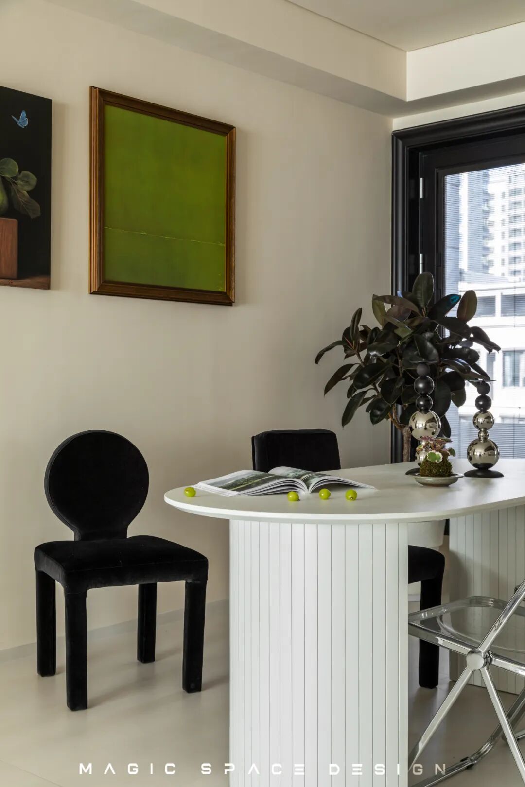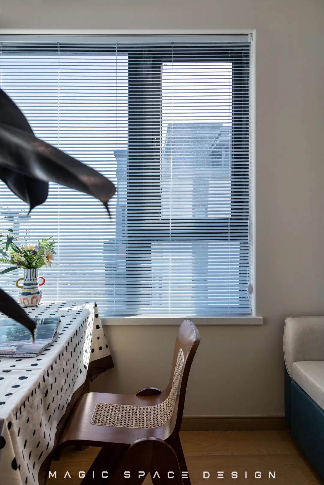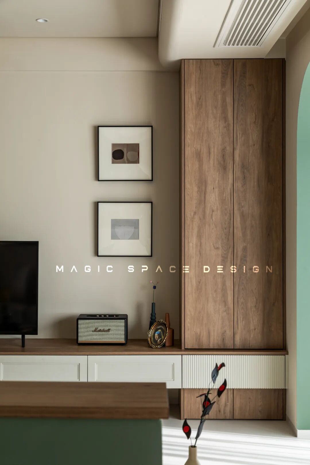 窗外有自然的景色,我们让整间阳台涂抹了青绿色,让内部空间不会被阻隔在景色之外。绿叶在上,树冠于下,这样纹理清晰的橡木边柜与这满墙的青绿便也相得益彰。