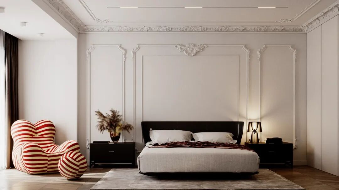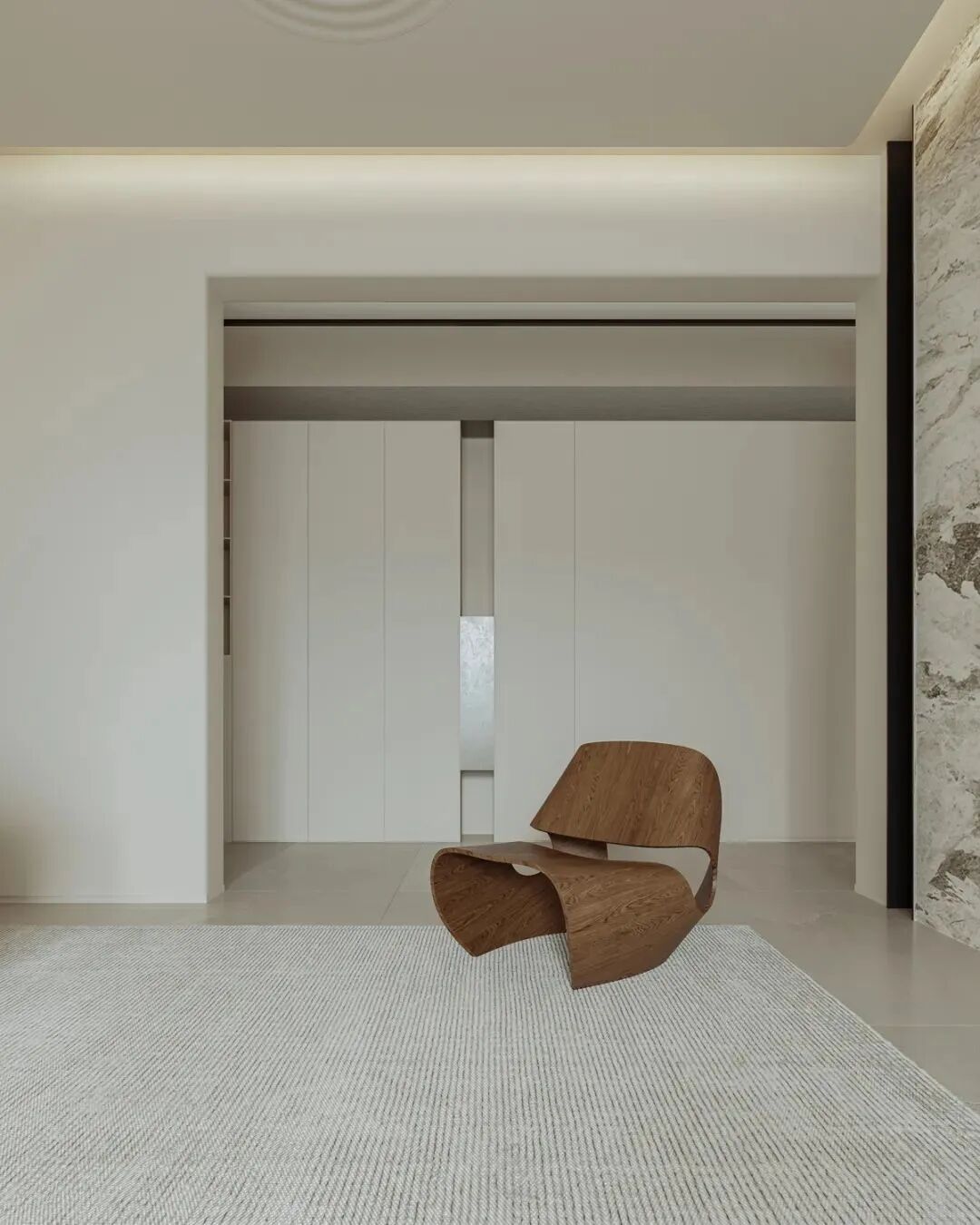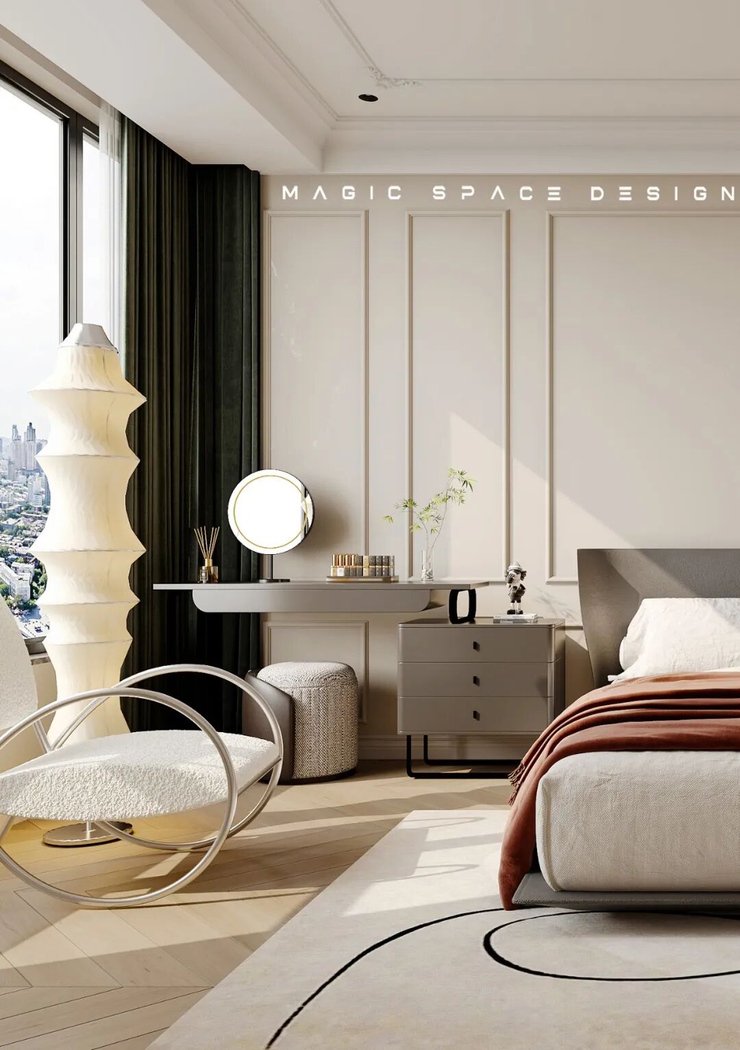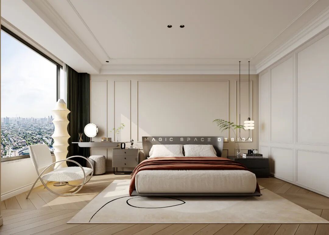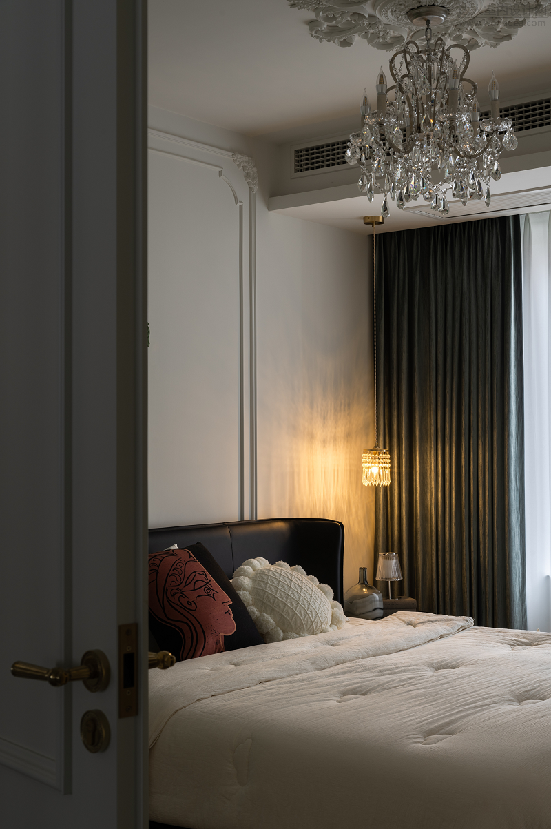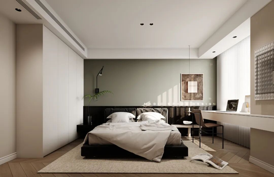 主卧延续了空间的简约设计,墙面加入PU线构建立面造型,没有过多的细节雕琢,静谧祥和。