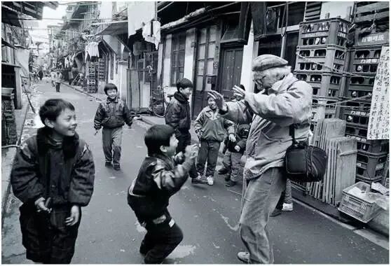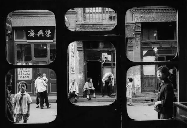 ▲ 马克.吕布曾送给上海美术馆6件”礼物",其有一幅名为《琉璃厂》的作品,拍摄于1957年。当时,马克和他的第一任太太一起在北京的琉璃厂买东西。第一任太太是美国雕塑家,出生在墨西哥,黑皮肤,他们的到来引来很多人围观。太太在挑选印章,马克却很不耐烦,"你们女人总是喜欢买很贵的东西。"他一边说一边把镜头对准窗外。于是,画面被窗户分隔成几件各自"独立"的小画面,右下角和左下角的小女孩都戴红领巾,向镜头的方向看,马克当时觉得她们是被派来监视自己的。几十年后,他总是喜欢把她们叫做"小天使"。