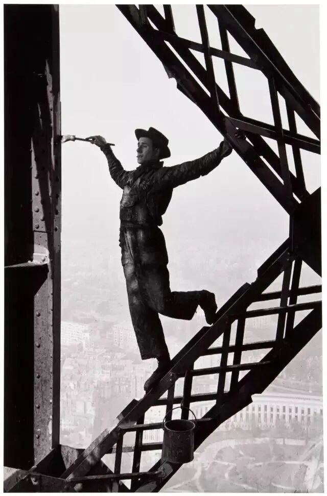 ▲ 1953年,这个拘谨的里昂人试图熟悉巴黎,他拿着布列松送的取景器,身上带一盒胶卷,用了一个小时的时间爬上了巴黎的象征——埃菲尔铁塔。刚开始拍照时,他完全不知道透过旧取景器的世界是倒立的,一时的眩晕让他险些摔倒。通过旧取景器观看,突然发现一个人倒挂在半空中,于是本能地按下快门,便有了这张舞蹈中的《铁塔上的油漆工》。这张照片也成了他进入马格南的入场券:布列松从整卷底片里挑中这张,由编辑莫瑞斯卖给了当时职业摄影师最向往的《生活》杂志发表。