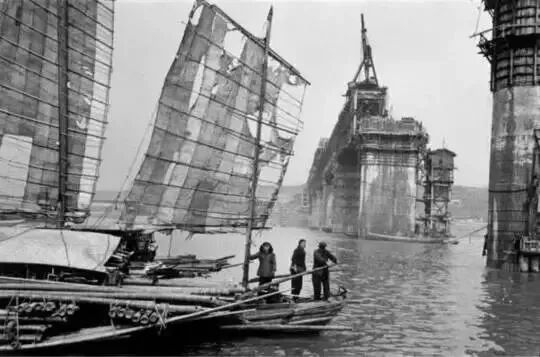▲湖北,汉口。由苏联援建的汉口长江大桥正在施工,1957